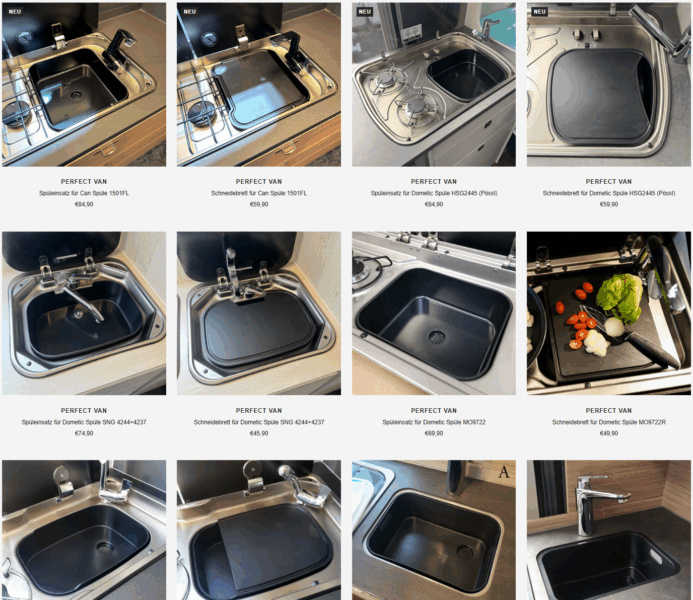 Man könnte herrlich kochen, schnippeln und spülen, wenn nur nicht so wenig Platz wäre. Die Lösung hat Perfect Van. Und die kann noch dazu einiges mehr. Für die gängigsten Spülen gibt es Einsätze: Dometic oder Can sind dabei die großen Hersteller. Eckig oder abgerundet, es gibt die verschiedensten Varianten.