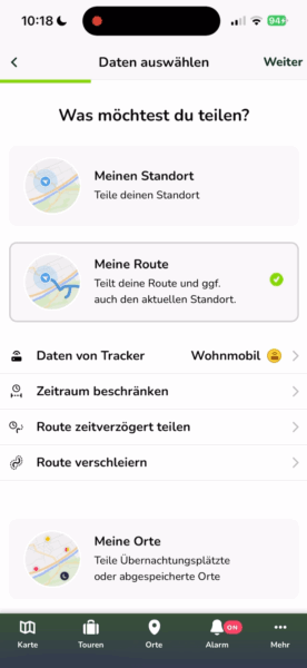 Auch ob deine Übernachtungsplätze oder deine abgespeicherten Orte gezeigt werden, entscheidest du selbst.
