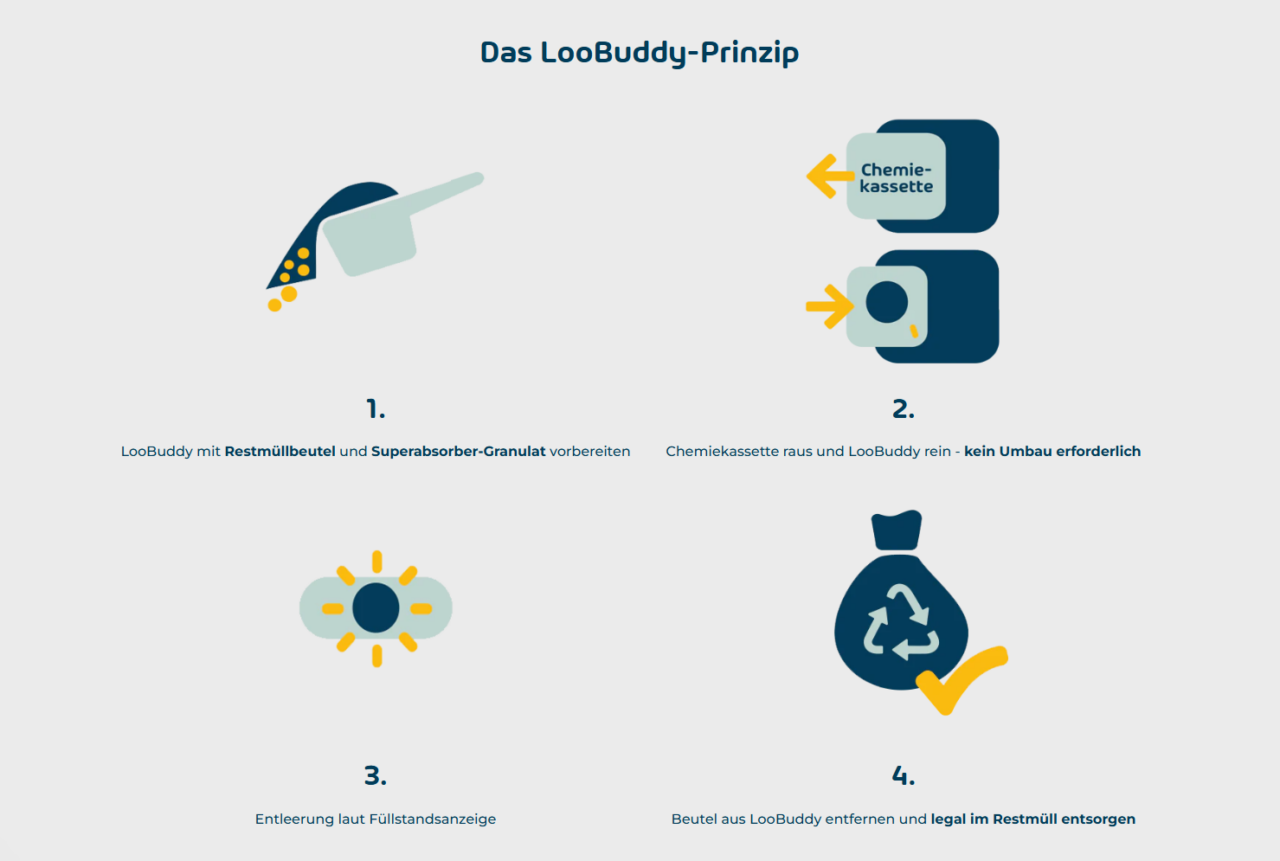 Die LooBuddy wird dabei mit einem Plastikbeutel versehen. Einen handelsüblichen Restmüllbeutel in die LooBuddy-Kassette legen – Superabsorber-Granulat mit dem Portionierlöffel dazu – das verfestigt später den Urin.