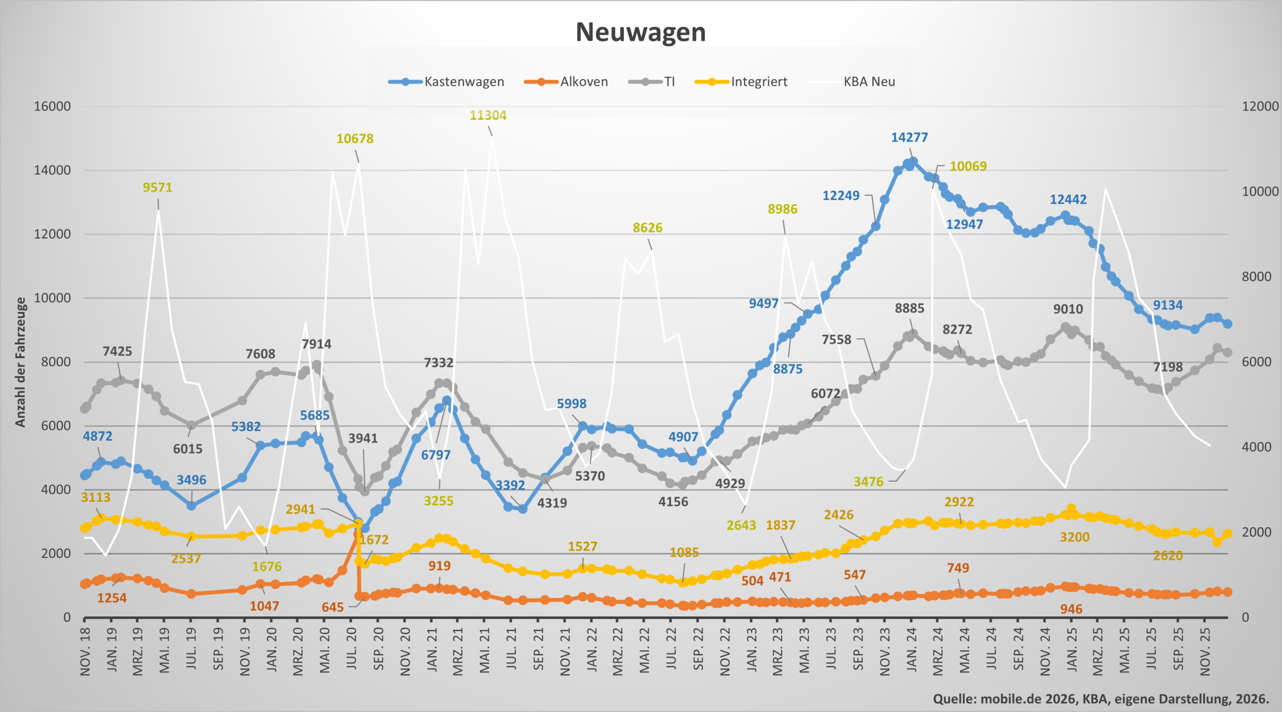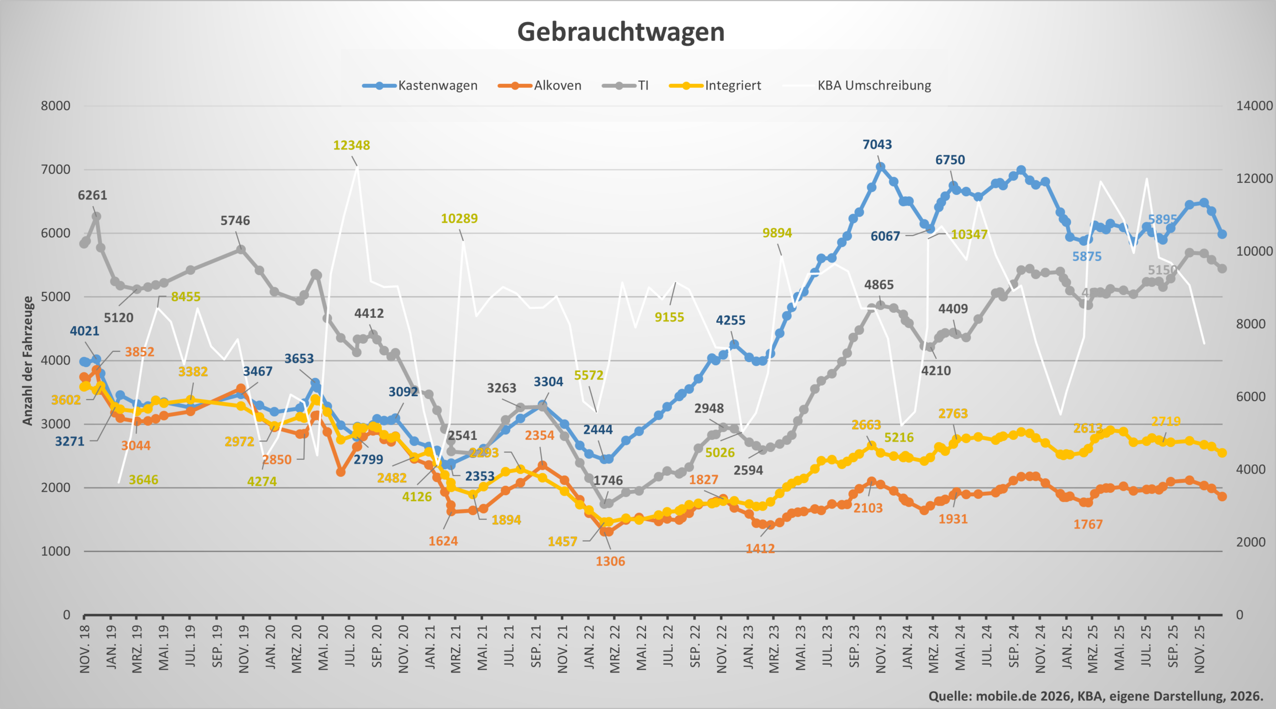 Teilintegrierte gelten aktuell als größte Problemgruppe im Neuwagenbereich. Auch hier sind die Höfe voll, die Nachfrage bleibt schwach, und viele Modelle stehen über Jahre. Positiv ist lediglich, dass die Angebotszahlen nicht weiter stark steigen.