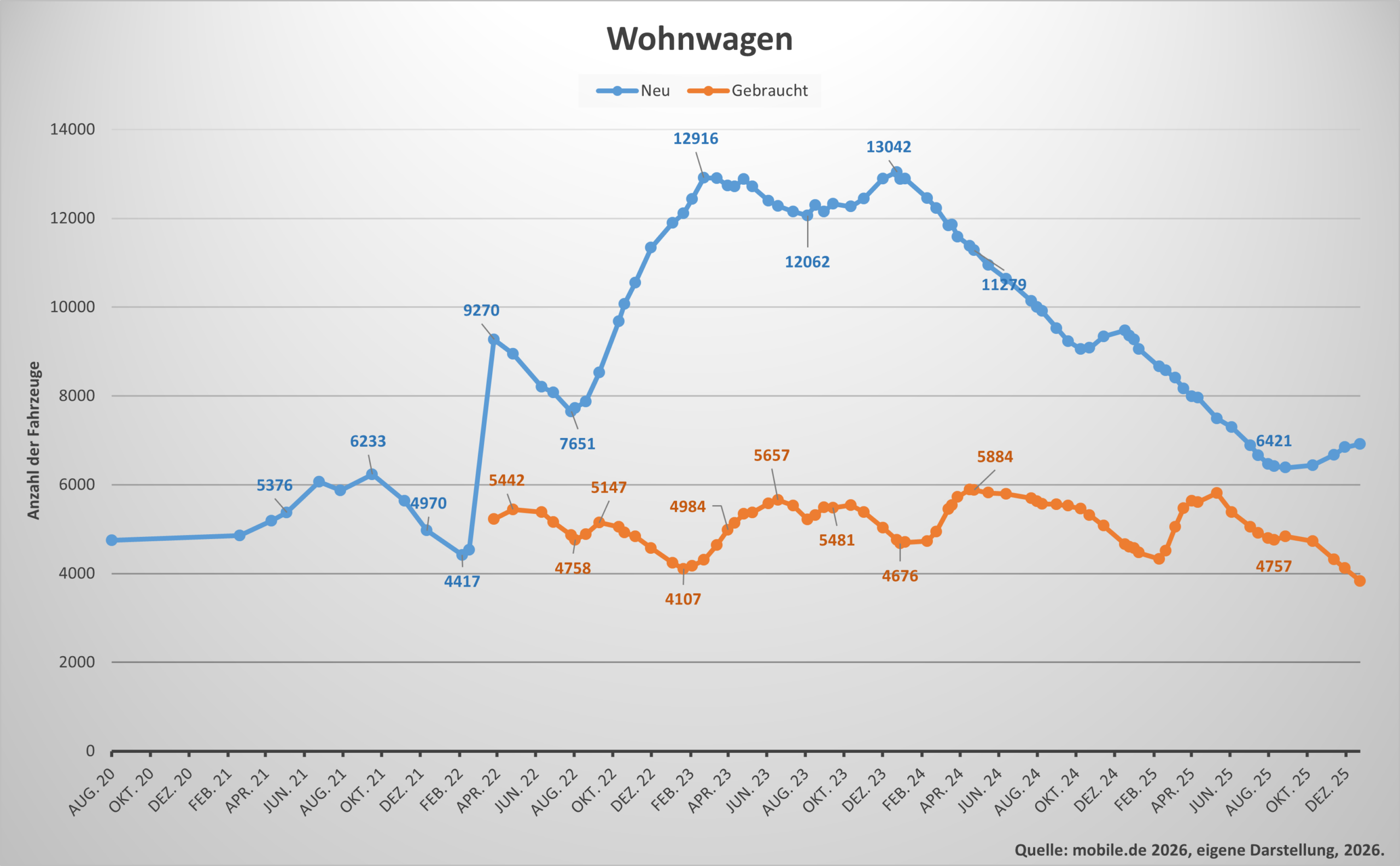 Im Wohnwagensegment ist Erstaunliches gelungen: Der Angebotsüberhang bei Neuwagen wurde weitgehend abgebaut. Trotz wachsendem Gesamtbestand hat sich der Markt stabilisiert. Das zeigt, dass konsequente Produktionssteuerung und realistische Absatzplanung funktionieren können – ein Beispiel, das sich die Wohnmobilbranche genauer ansehen sollte.