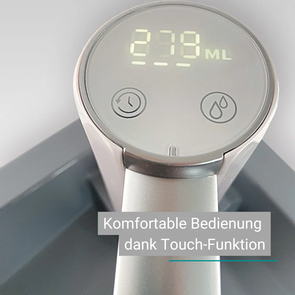 Oben sitzt ein robustes Waschbecken mit elektrischem Wasserhahn.