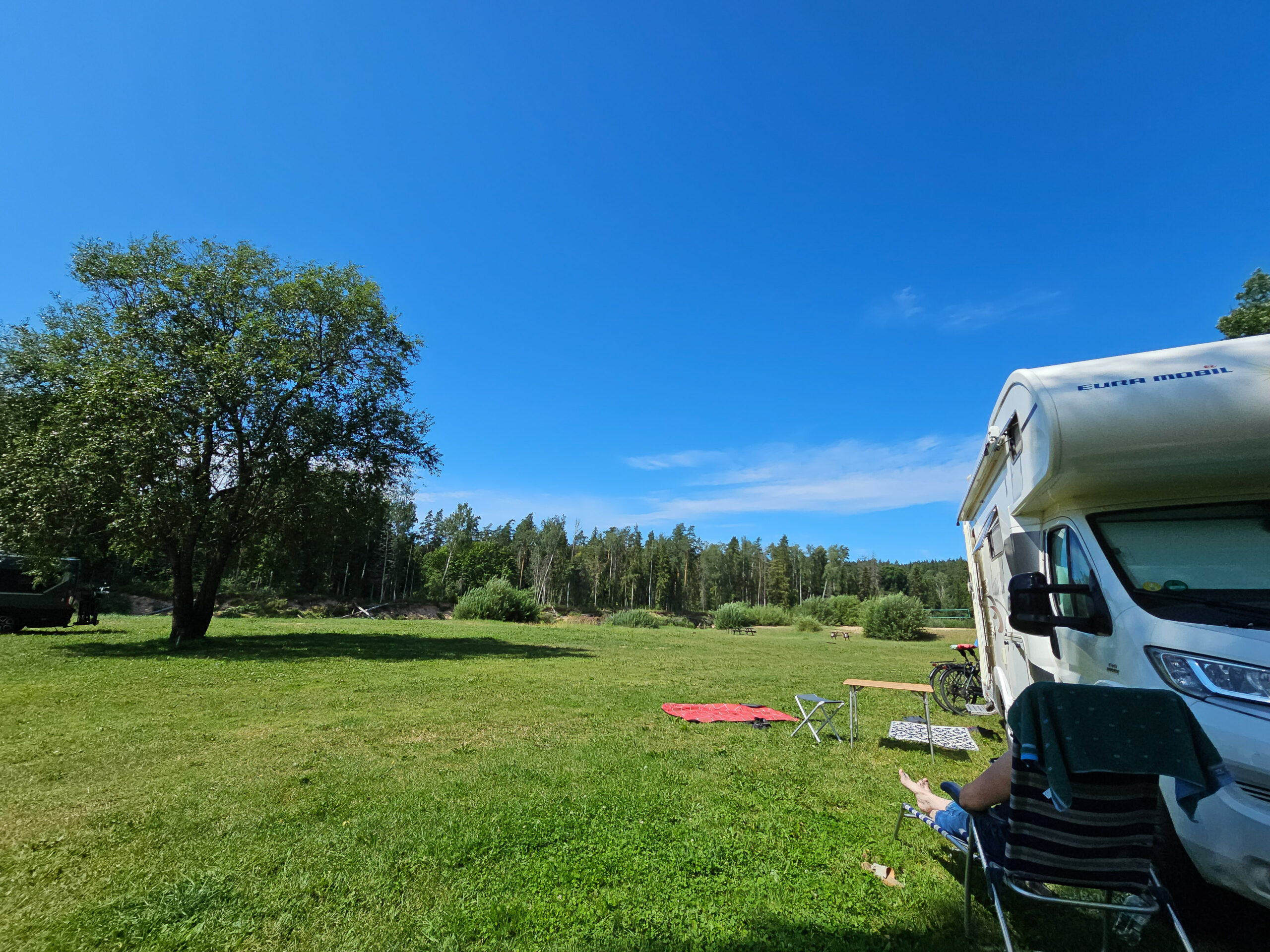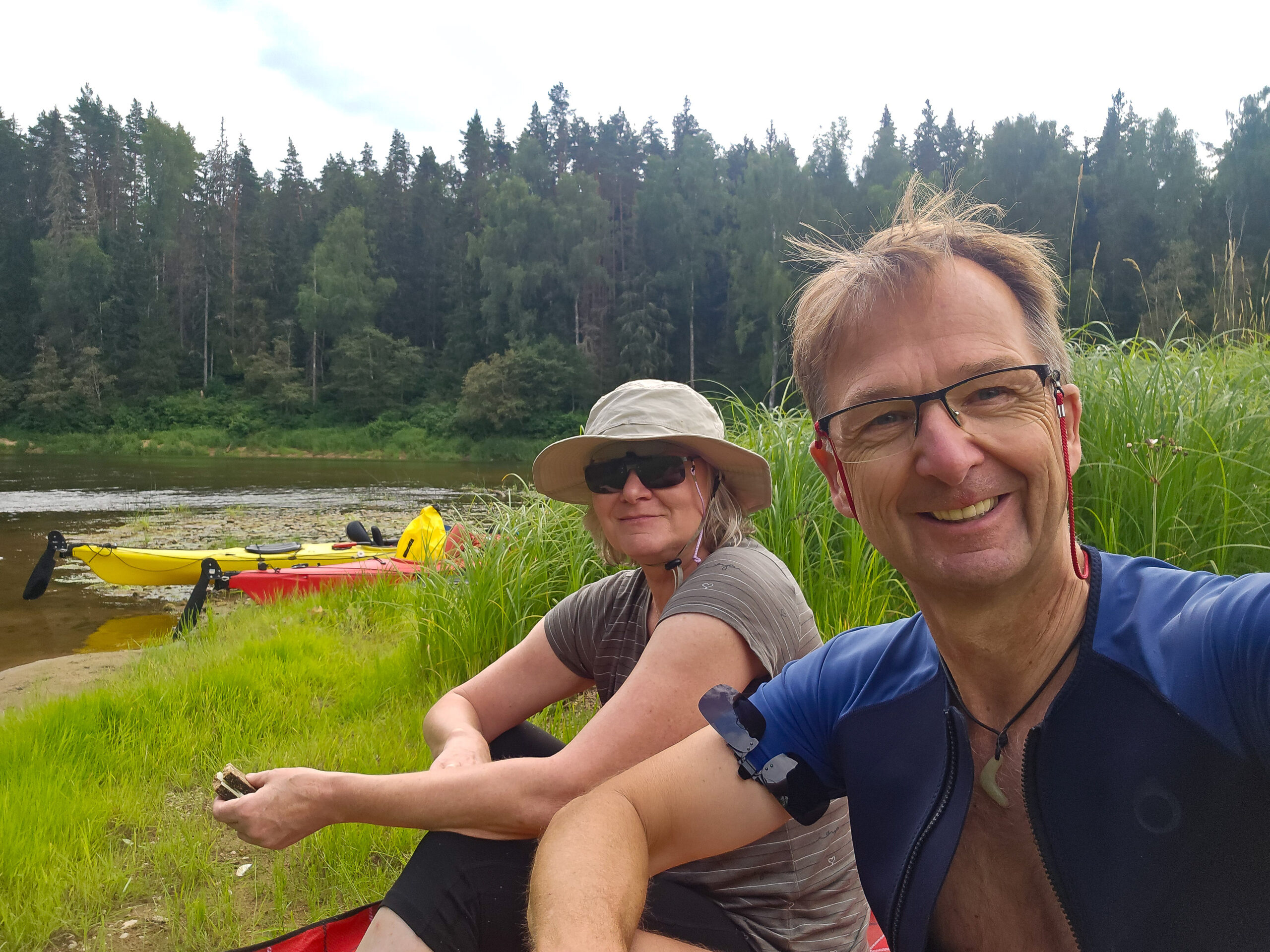 Wir nutzen die Zeit und genießen das schöne Wetter, sitzen viel vor dem Wohnmobil auf unserem schönen, liebenswerten, kleinen Campingplatz. Direkt am Wasser schauen, wir den Booten und Flößen zu, die den Fluß heruntertreiben, Familien, Gruppen, Sportler. Obwohl Hauptsaison ist, ist nicht viel los. Der Krieg in der Ukraine hat viele Touristen abgeschreckt, es sind fast nur Einheimische unterwegs und einige verwegene, die sich nicht abschrecken lassen. Und auch unser Mann von der Fähre ist mit seinem Boot hier angekommen und wir bedanken uns für den Tipp in Riga.