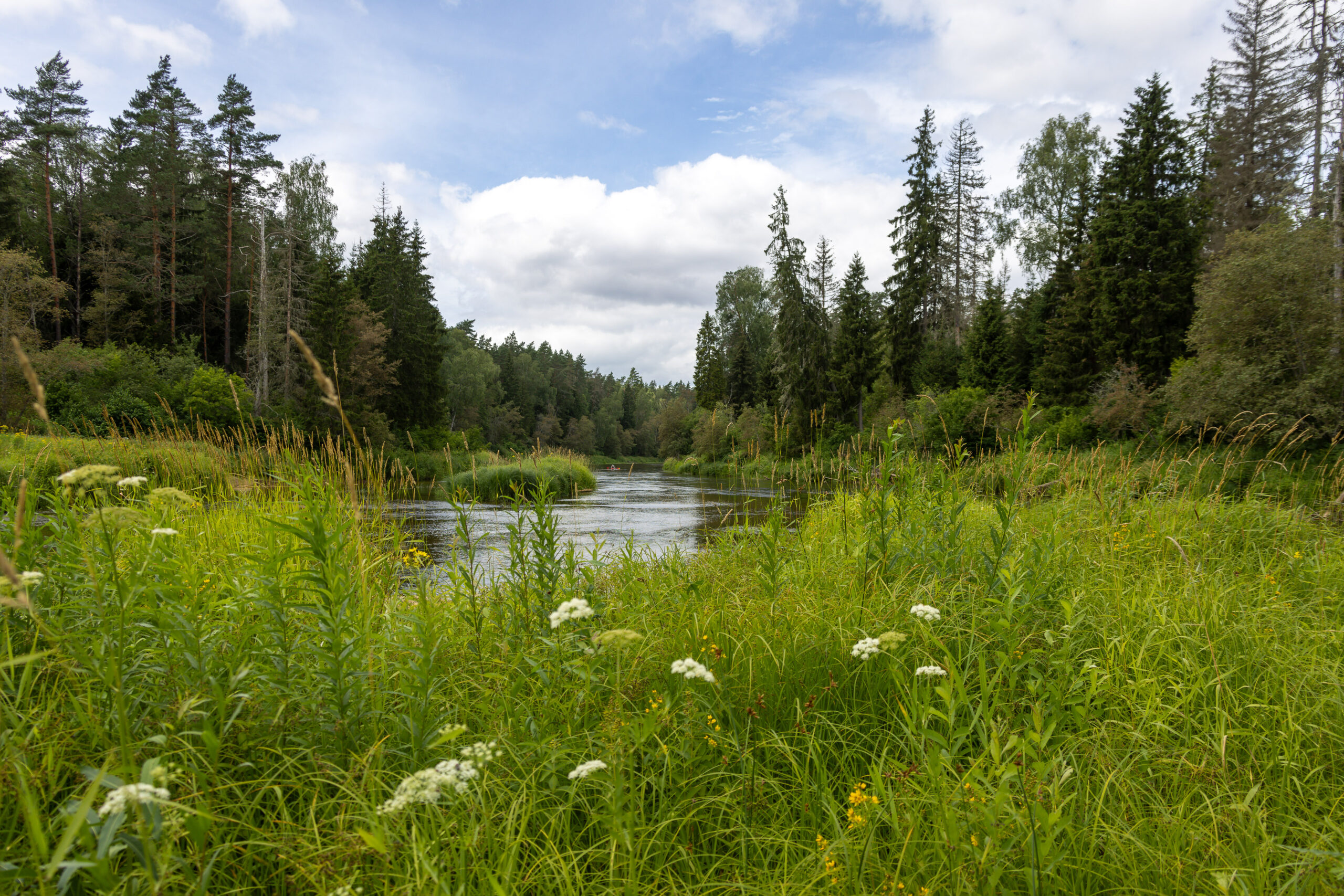 Der Fluss schlängelt sich auf dem Territorium des Nationalparks in 98 größeren und kleineren Windungen durch das Tal. An seinen Ufern nisten Eisvögel, Uferschwalben, Fischreiher und sogar der seltene Schreiadler. In den Wäldern sind Elche, Hirsche, Luchse und Wölfe heimisch – und die Gauja ist eines der wenigen verbliebenen Habitate für Ottern in Europa.