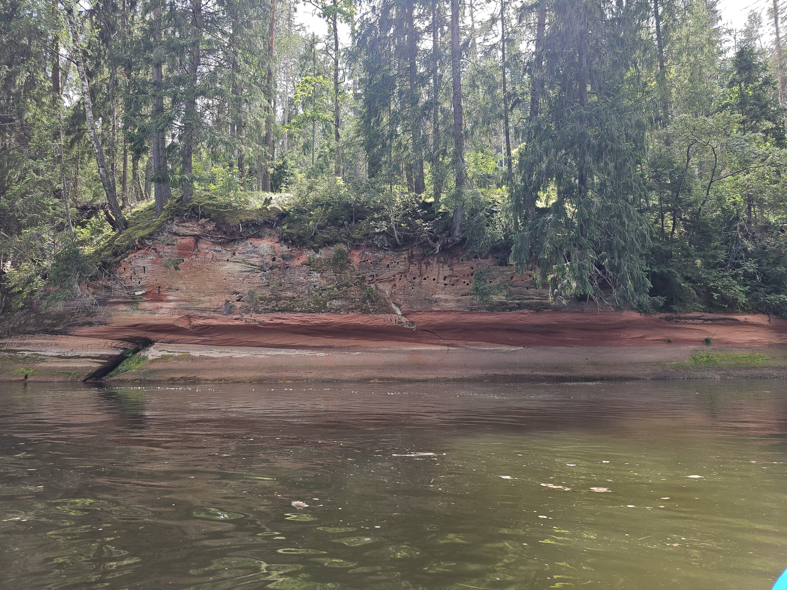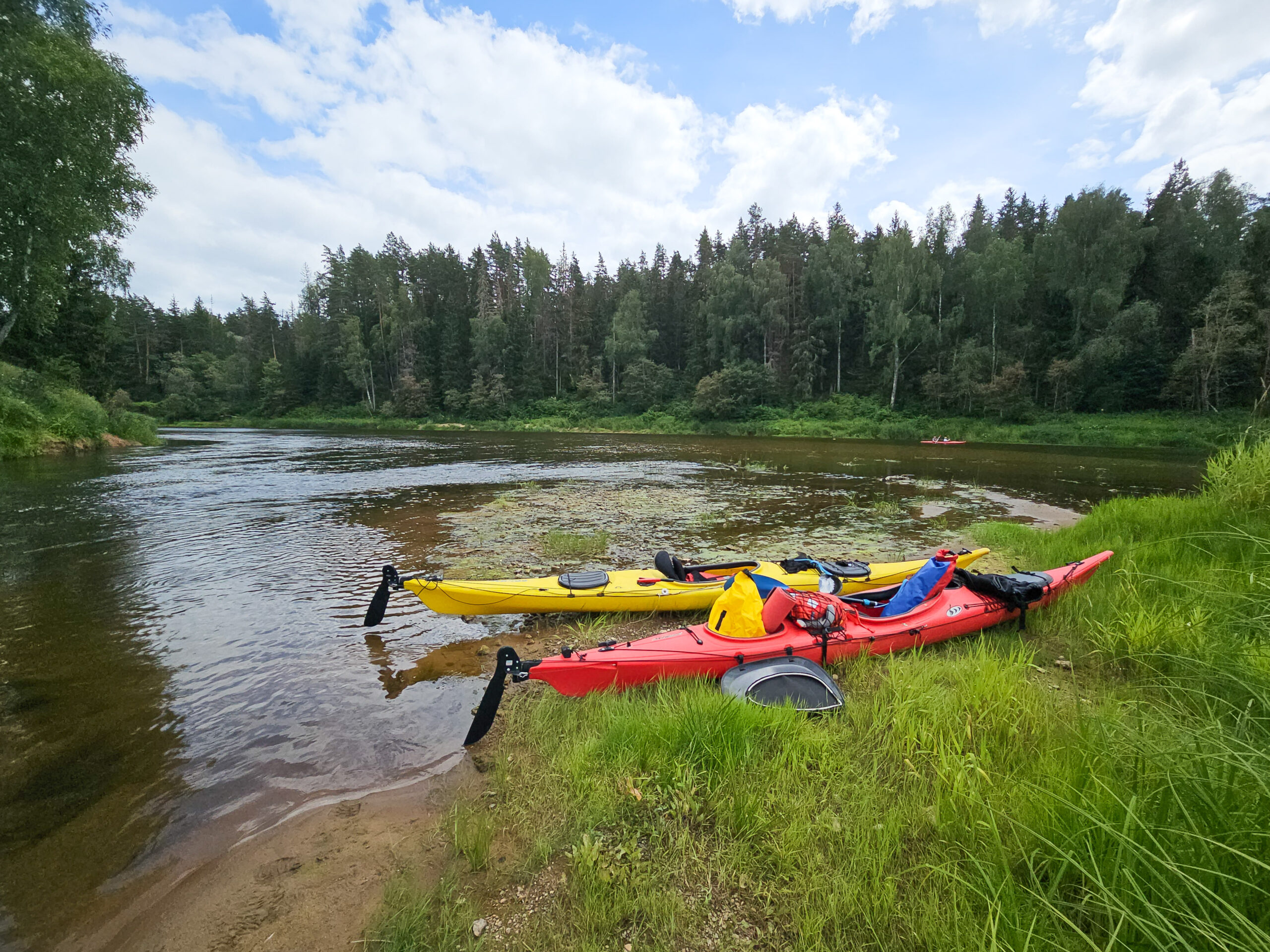 Die Leute vom Campingplatz organisierten alles: Wir starteten morgens mit den Kajaks am Ufer, paddelten den ganzen Tag die Gauja hinunter – durch stille Abschnitte mit hohen Bäumen zu beiden Seiten, an rötlichen Sandsteinfelsen vorbei, über kurze Stromschnellen und durch weite Bögen, in denen man manchmal minutenlang keinen Ton hörte außer dem Wasser. Abends holten sie uns mit den Booten wieder ab. So muss das sein.