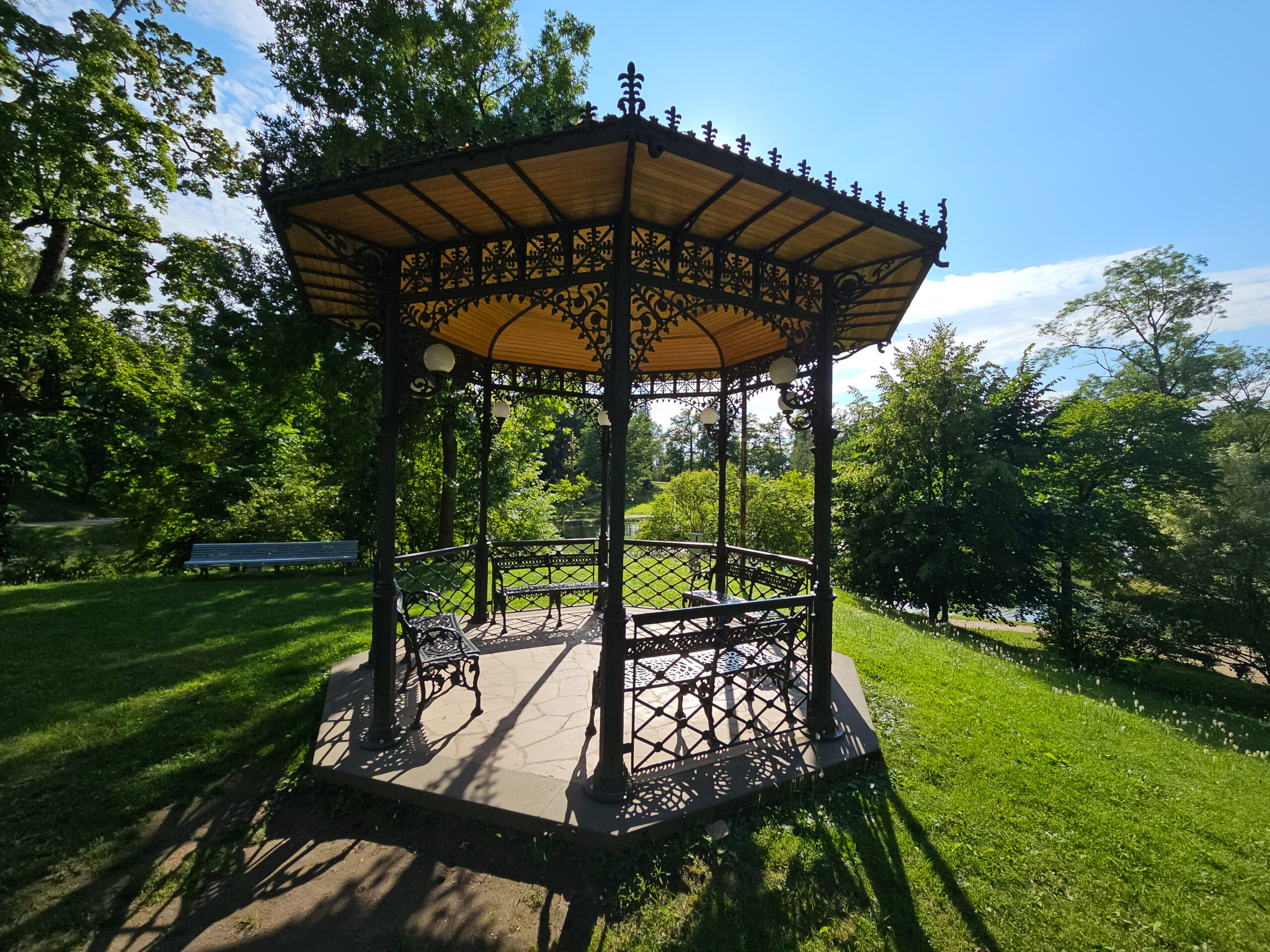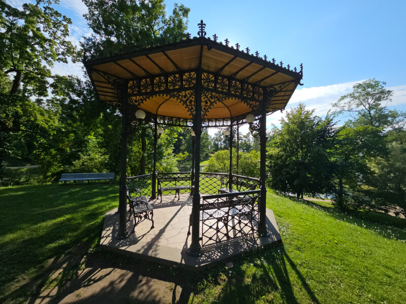 Nach der Burg spazierten wir durch den Schlosspark und durch die alten Gassen der Innenstadt. Holzhäuser, manche frisch gestrichen, manche noch wartend. Eine Stadt, die langsam wieder zu sich selbst findet. Der Stadtpark mit seinem gusseisernen Pavillon, Blumenbeeten und alten Bäumen ist einer dieser Orte, an denen man einfach sitzen und nichts tun möchte. Das haben wir getan.