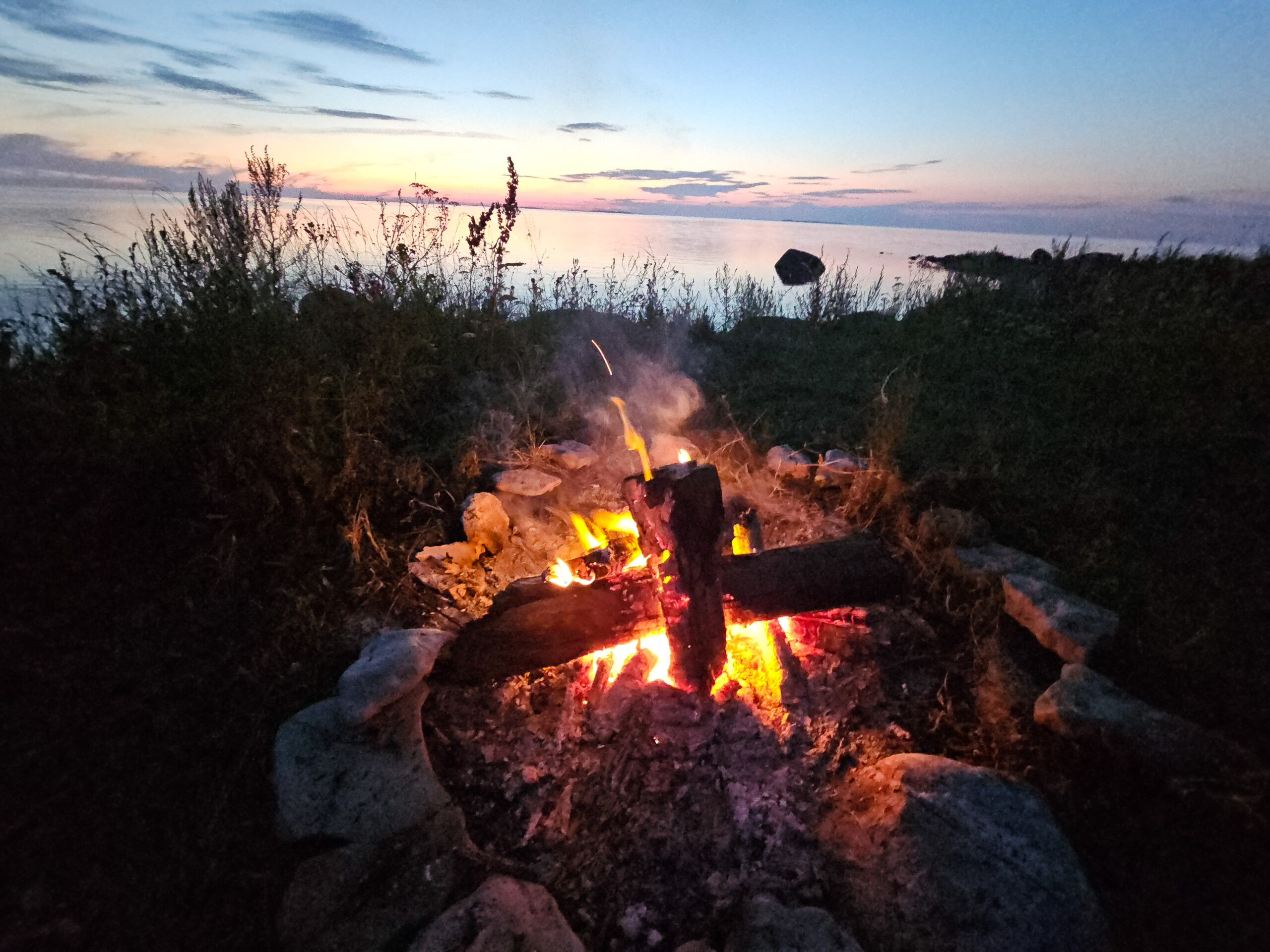 Abends das erste Lagerfeuer direkt am Meer. Die Sonne geht in einem Orangerot unter, das keiner Beschreibung standhält. Und Schmetterlinge in einer Menge, die uns verblüfft – über den Wiesen, an den Büschen, auf jedem warmen Stein. Als hätte jemand sie über die ganze Insel ausgeschüttet.
