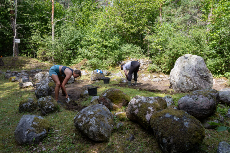 Eine kleine, unscheinbare Beschilderung zeigt auf einen Waldpfad. Wir biegen ein – und stehen plötzlich vor einer Szene, die uns festhält: ein3 Gruppe junger Leut, mit Spaten und Rechen und zwei junge Frauen, die zwischen großen moosbedeckten Steinen knien und mit Pinseln und kleinen Kellen arbeiten. Archäologiestudenten.