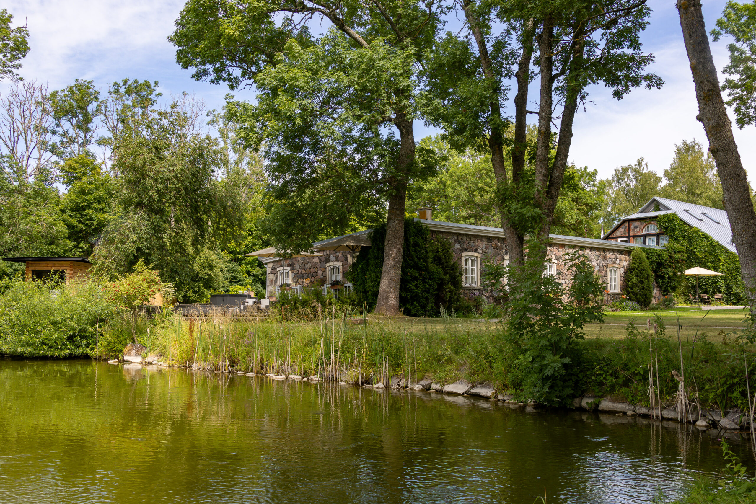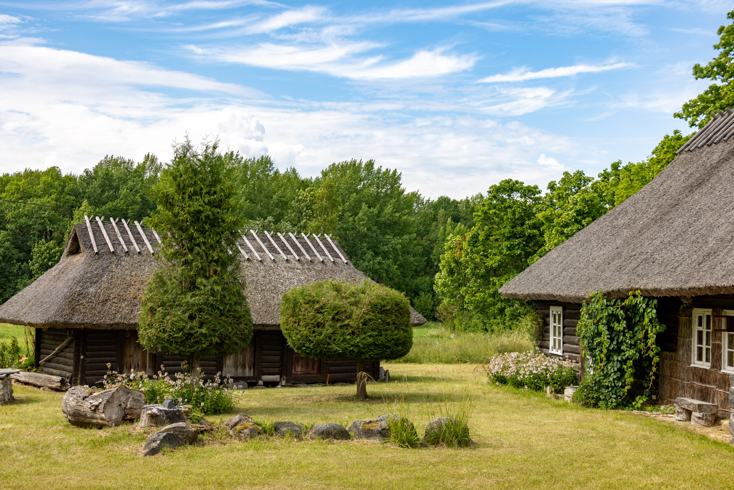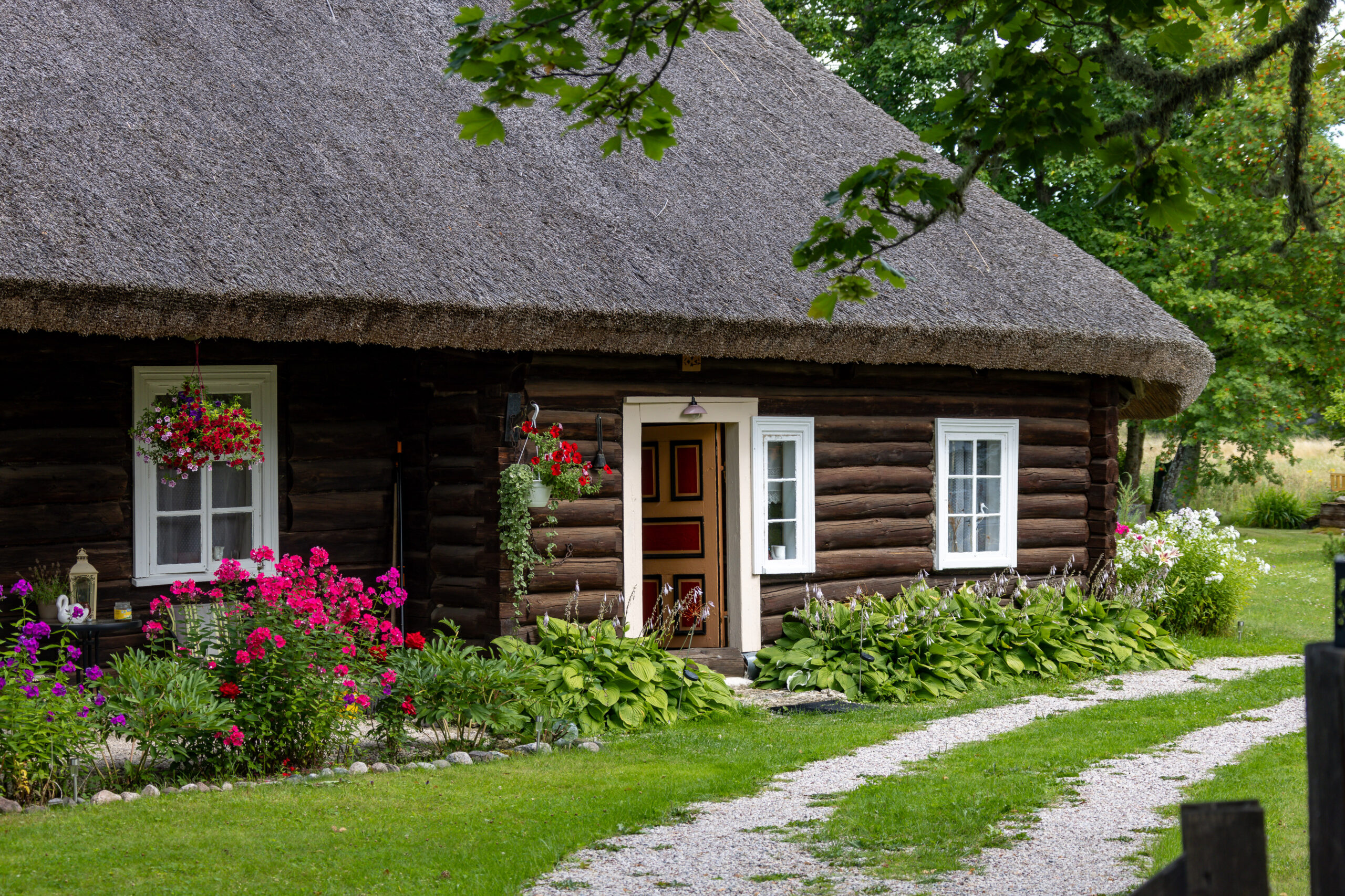 Dann die Straße Suuremõisa Laheküla tee. Wir fahren langsamer, weil wir nicht aufhören können, die Häuser zu betrachten. Alte Holzgebäude mit frisch gestrichenen Fenstern. Steinmauern mit Moos. Türen in tiefem Rot, dunklem Grün, manchmal mit Schutzsymbolen eingeritzt, die man beim zweiten Blick erkennt. Gärten voller Blumen, gepflegt wie Vorgärten irgendwo in Schweden. Ein Mann sitzt auf seiner Bank und hebt grüßend die Hand, als wir vorbeifahren.