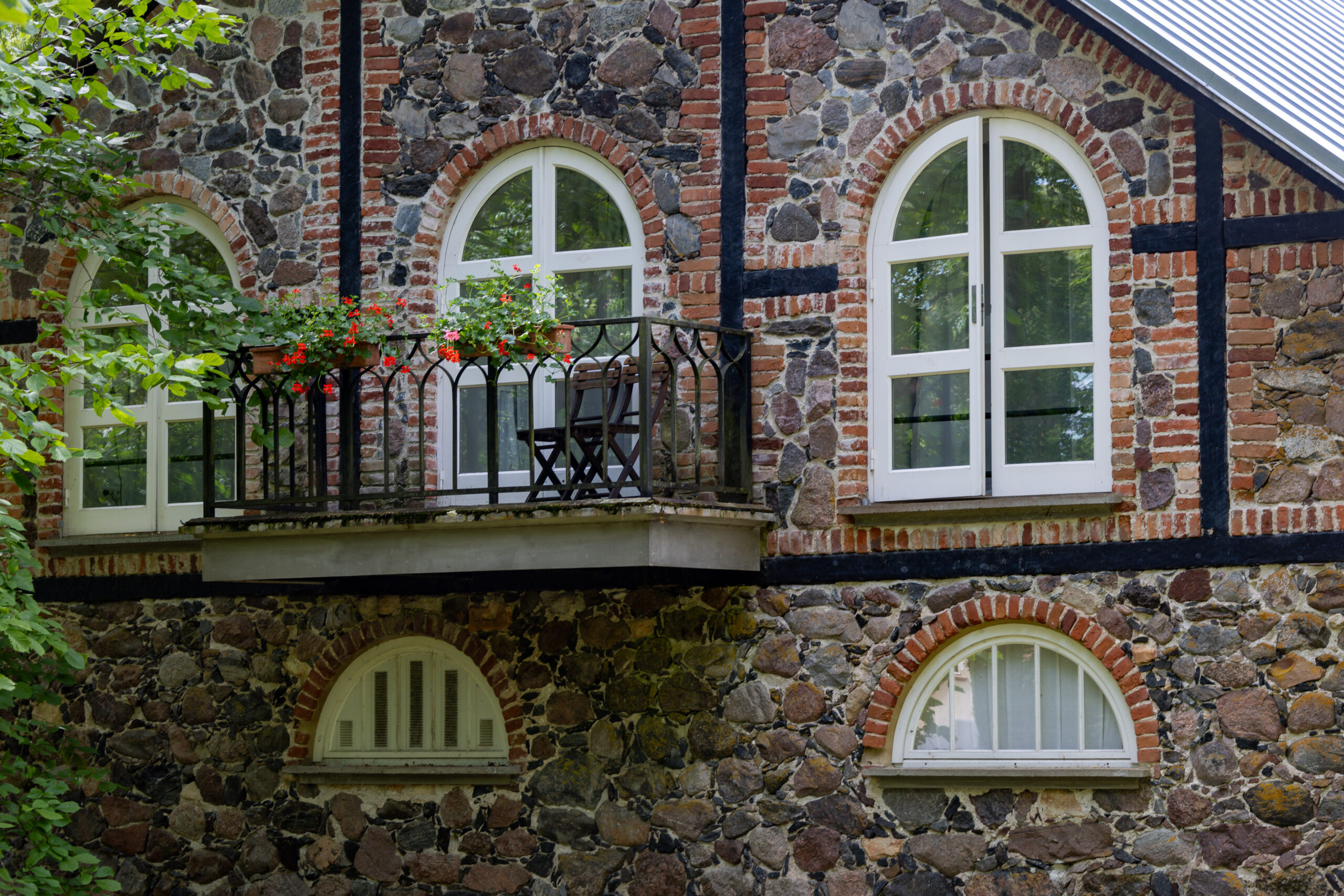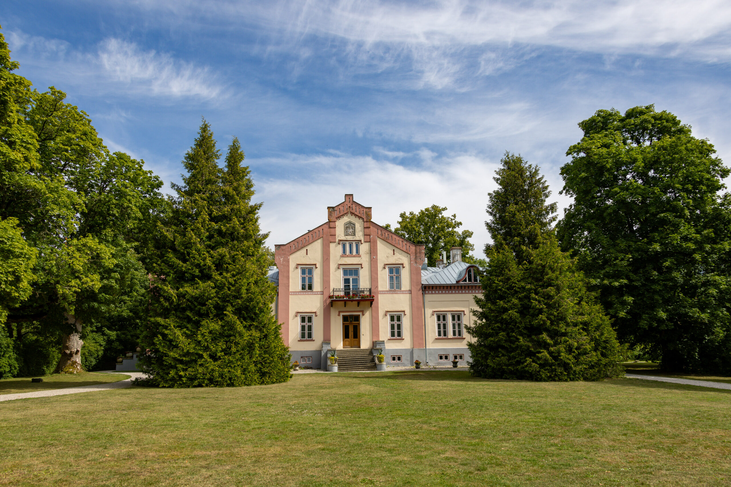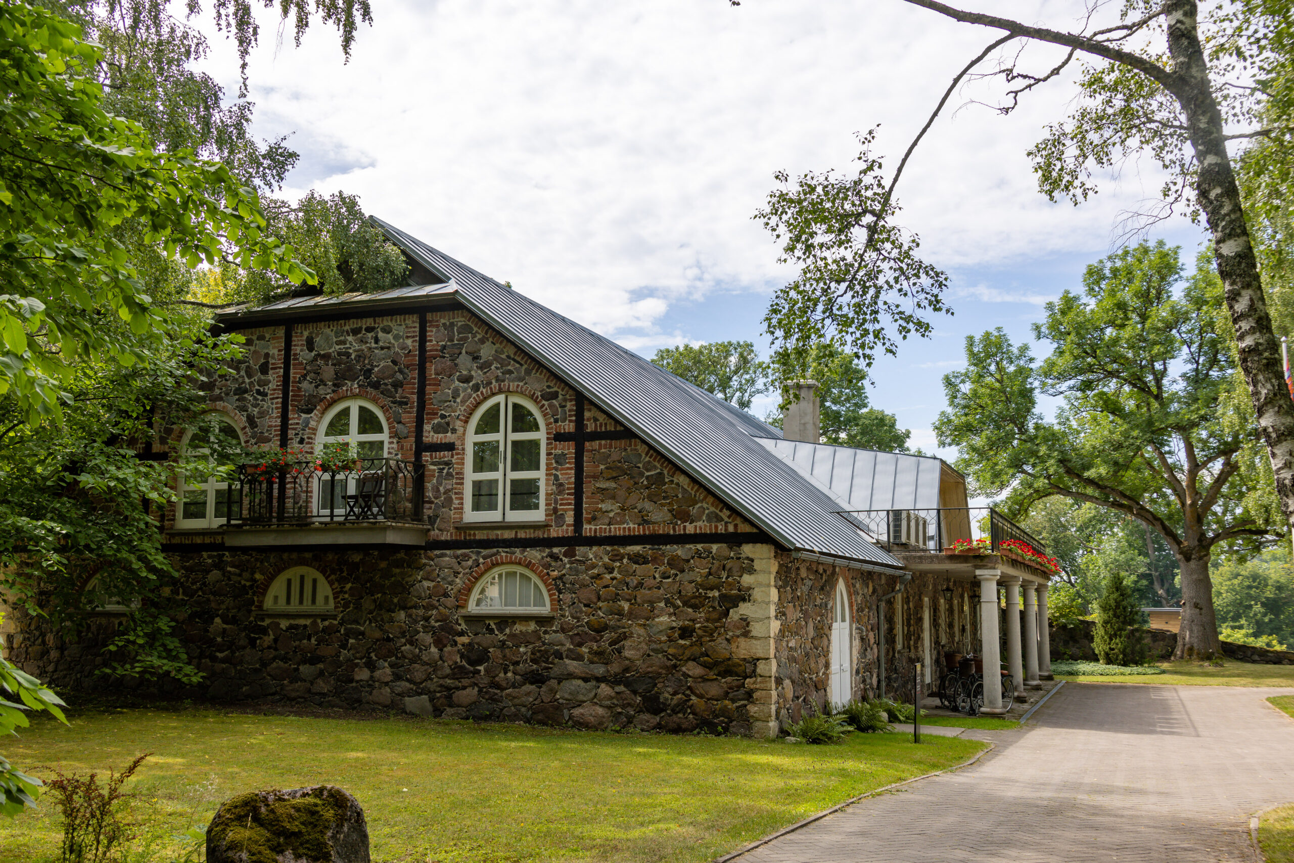 Dann die Straße Suuremõisa Laheküla tee. Wir fahren langsamer, weil wir nicht aufhören können, die Häuser zu betrachten. Alte Holzgebäude mit frisch gestrichenen Fenstern. Steinmauern mit Moos. Türen in tiefem Rot, dunklem Grün, manchmal mit Schutzsymbolen eingeritzt, die man beim zweiten Blick erkennt. Gärten voller Blumen, gepflegt wie Vorgärten irgendwo in Schweden. Ein Mann sitzt auf seiner Bank und hebt grüßend die Hand, als wir vorbeifahren.