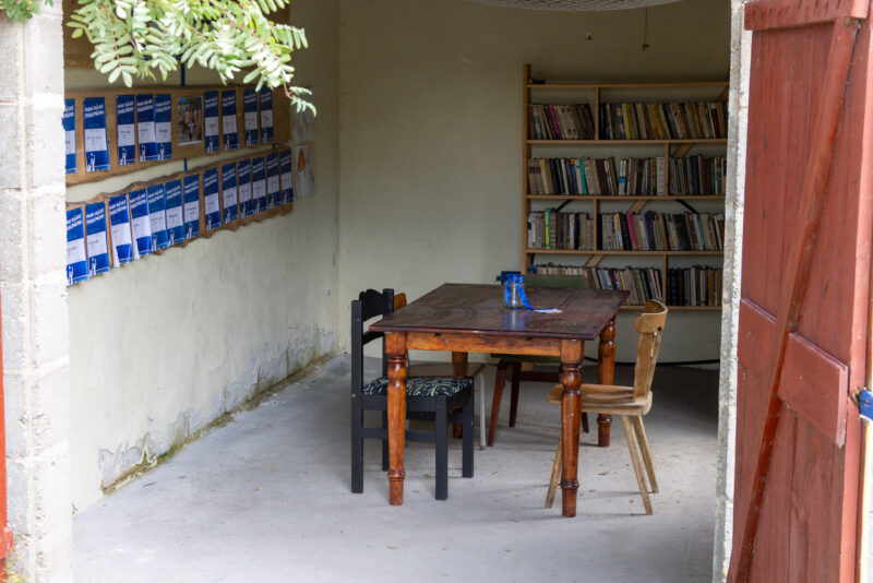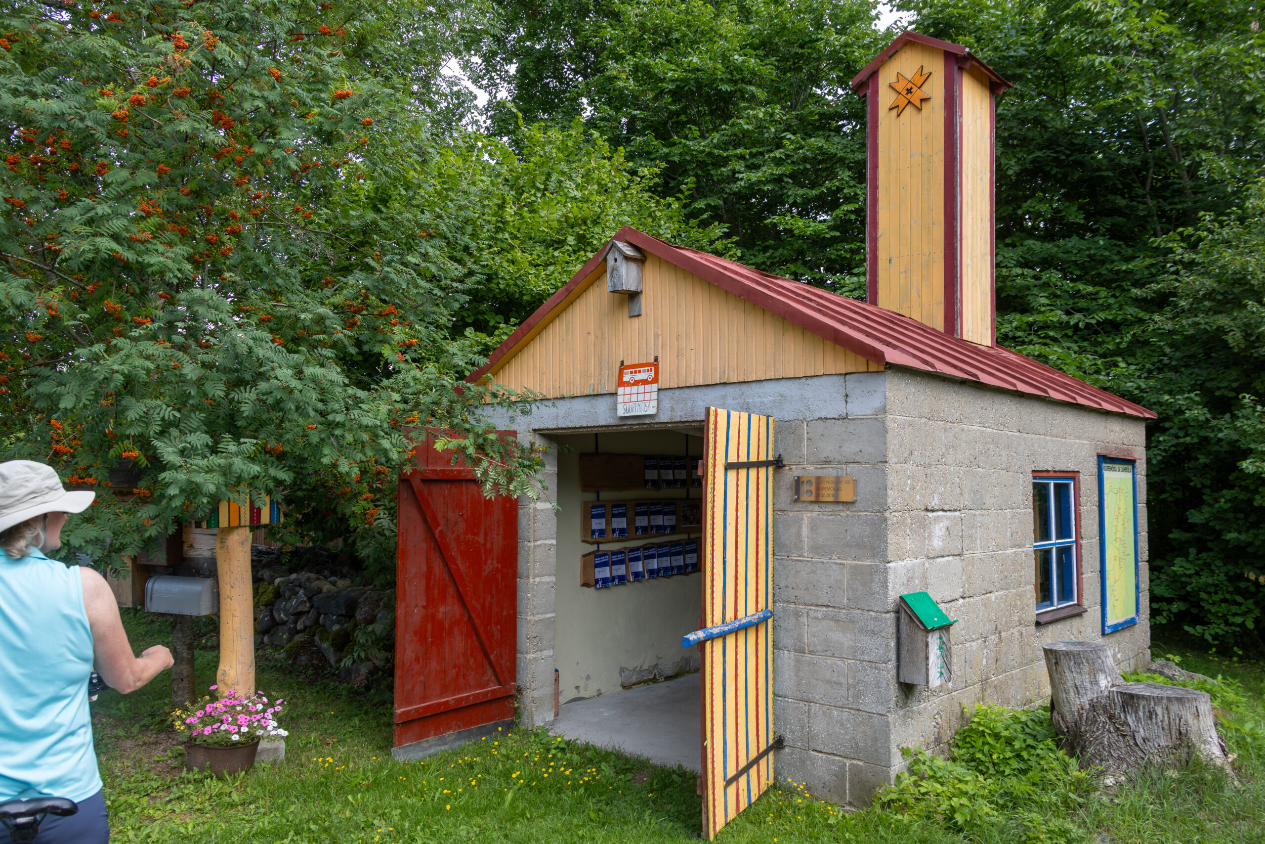 Und dann stoßen wir auf etwas, das uns sofort anhalten lässt. Eine Bushaltestelle – aber keine normale. Ein kleines Betongebäude, das aussieht wie ein miniaturisiertes Feuerwehrhaus: bunte Tür in Gelb und Rot, ein Vogelhaus am Giebel, ein Sternsymbol oben am Kamin. Wir schieben die Tür auf. Drinnen: ein alter Holztisch mit zwei Stühlen, und an der Wand ein ganzes Regal voller Bücher. Eine kleine öffentliche Bibliothek, die gleichzeitig Wartehäuschen ist. Man setzt sich, blättert, schaut. Schön, dass es so etwas gibt.