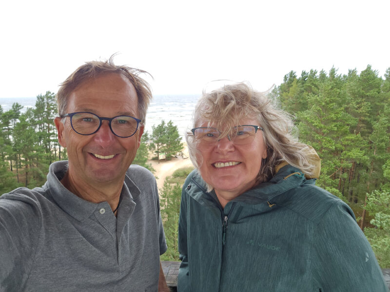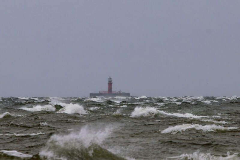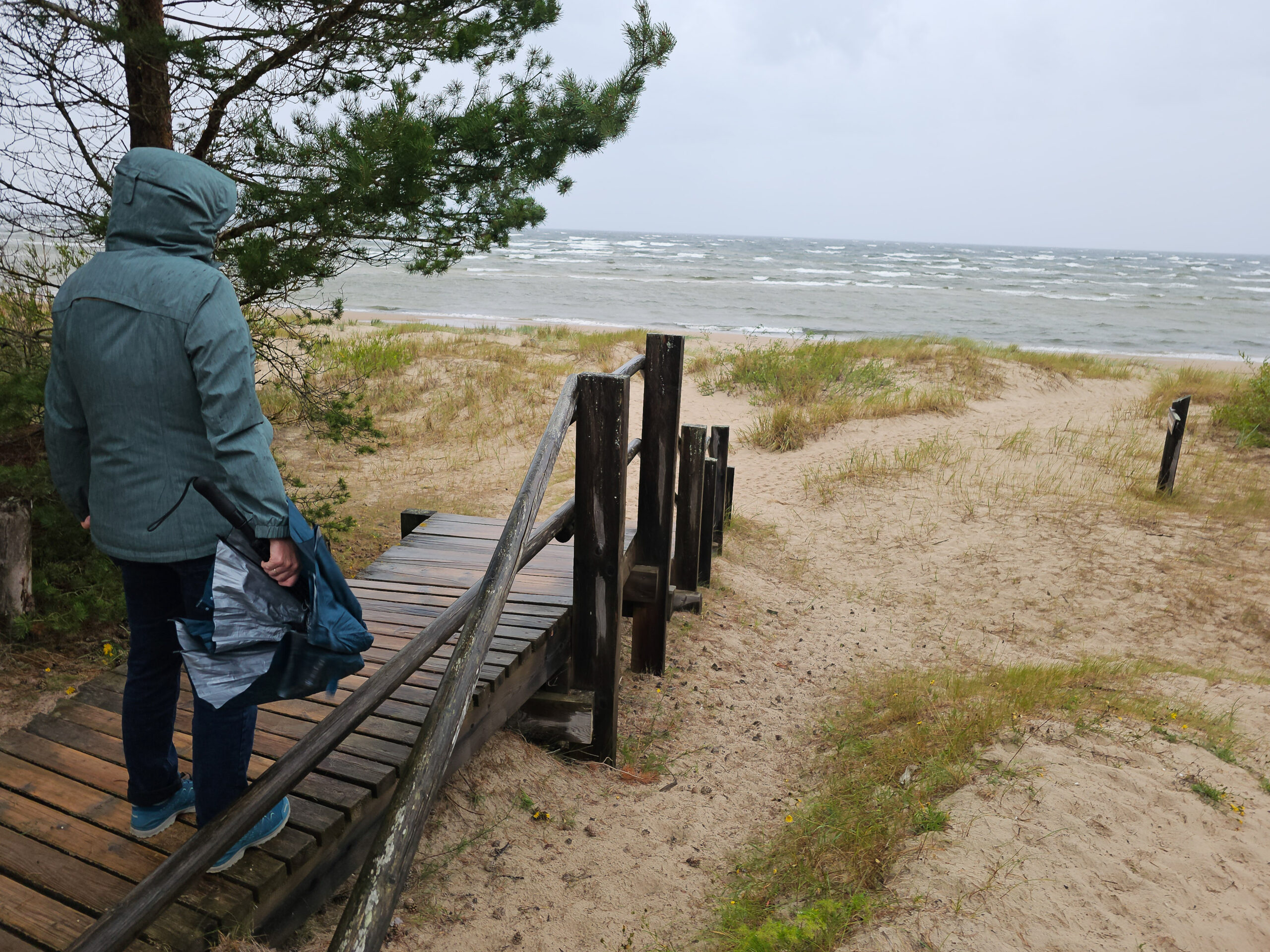Wir schauen uns erst vom Aussichtsturm aus um. Unter uns: graugrüne Wellen, weiße Schaumkronen, und mittendrin, weit draußen auf dem Wasser, der rote Leuchtturm von Kolka. Er scheint in den Wellen zu verschwinden. Ein unglaubliches Bild.