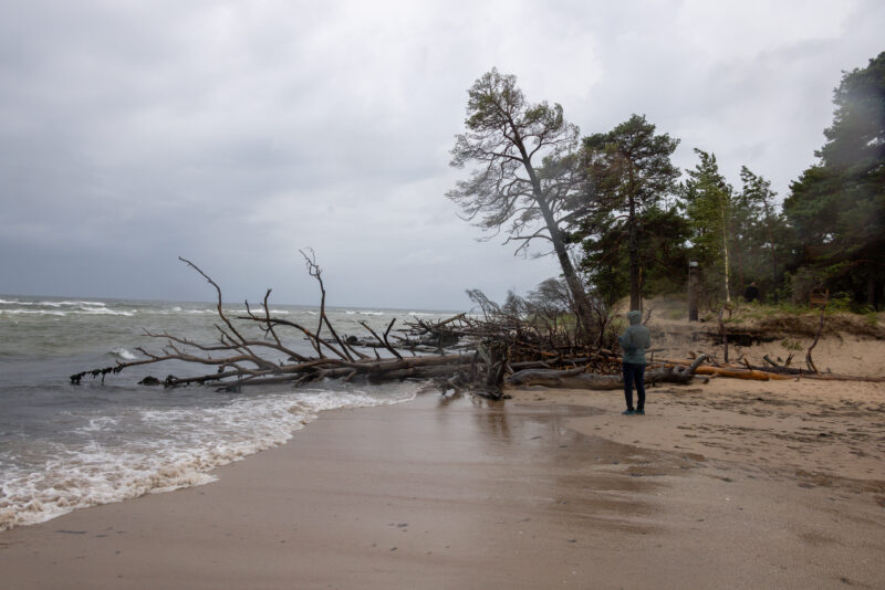 Umgestürzte Bäume. Dutzende davon. Eichen, Kiefern, Birken – sie liegen im Sand, halb im Wasser, die Wurzeln in die Luft gestreckt. Ein Mann, dem wir am Strand begegnen, zeigt uns Fotos, die er regelmäßig aus derselben Perspektive macht: man sieht, wie der Wald Schritt für Schritt verschwindet. In den vergangenen 130 Jahren hat das Meer rund 130 Meter Land auf beiden Seiten des Kaps abgetragen. Ein Meter pro Jahr. Unaufhörlich.