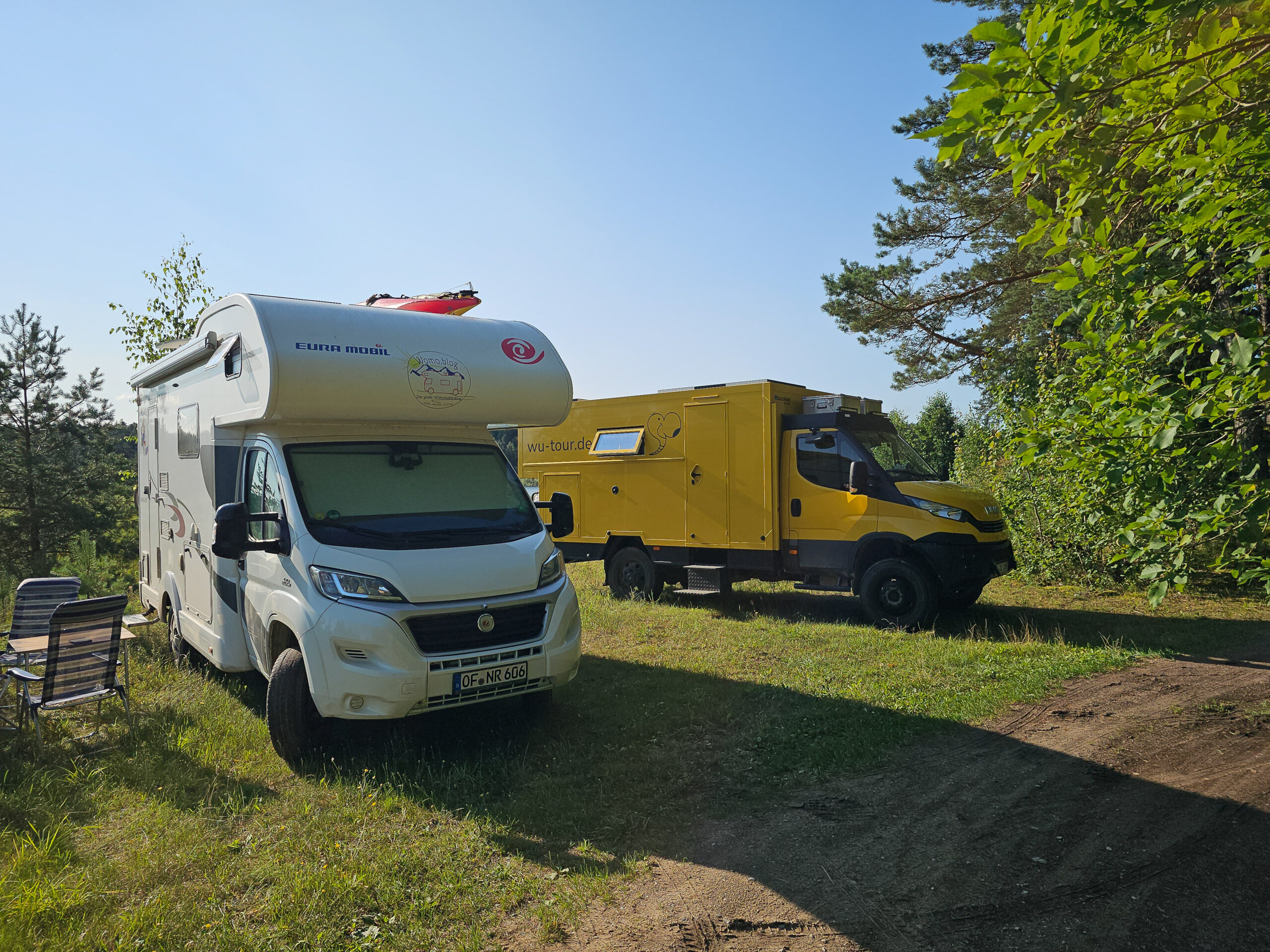 Wir übernachten auf dem Parkplatz im Wald, zusammen mit einigen anderen Wohnmobilen.