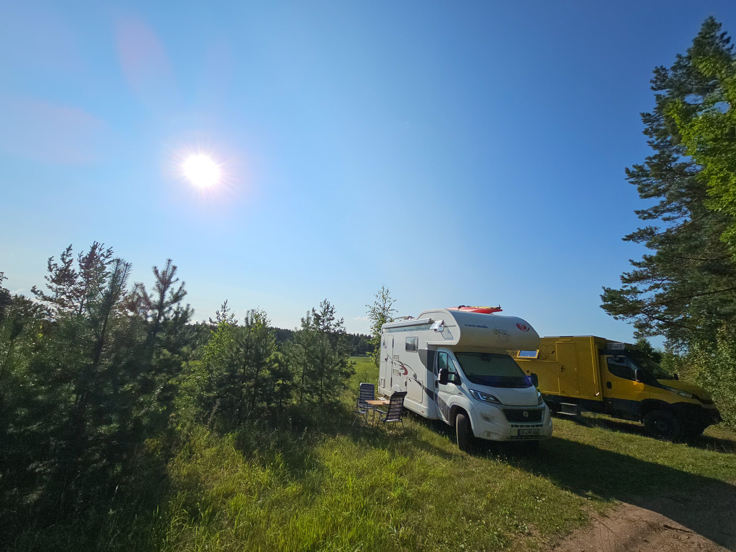 Kaum haben wir beschlossen, uns zu treffen, reißt der Himmel auf. Die Sonne kommt heraus, als wäre nichts gewesen. Nach einer dreißig Kilometer langen Fahrt über echte lettische Pisten kommen wir tatsächlich zueinander.
