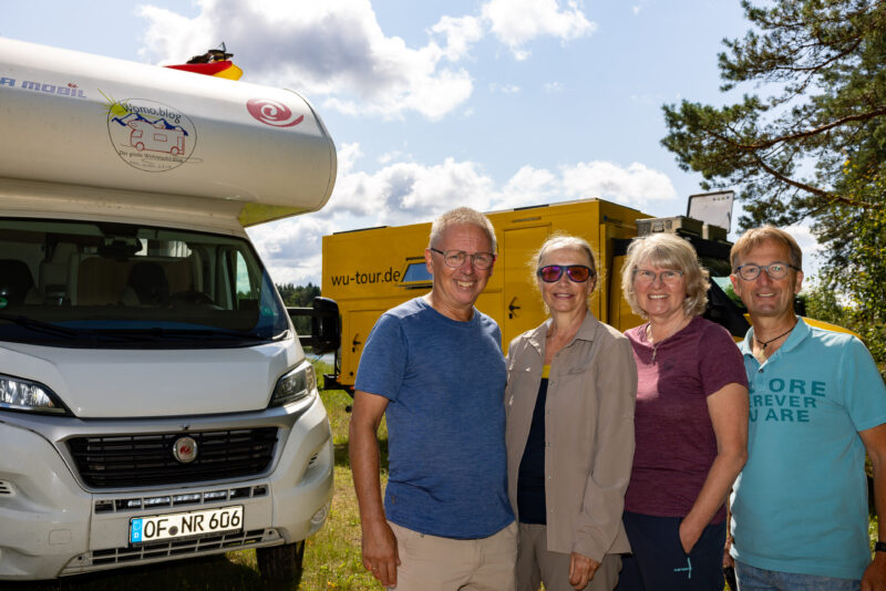Hinter ihnen steht ihr gelbes Expeditionsmobil auf einem Iveco-Fahrgestell, daneben unser weißes Eura Mobil – ein schönes Bild.