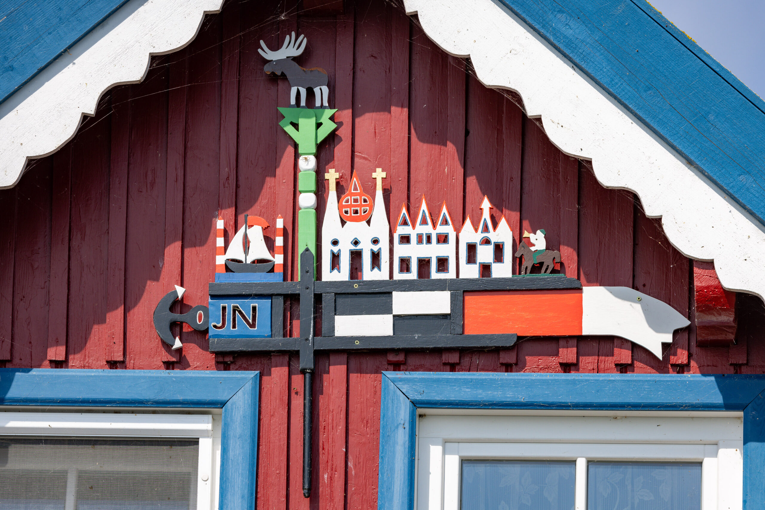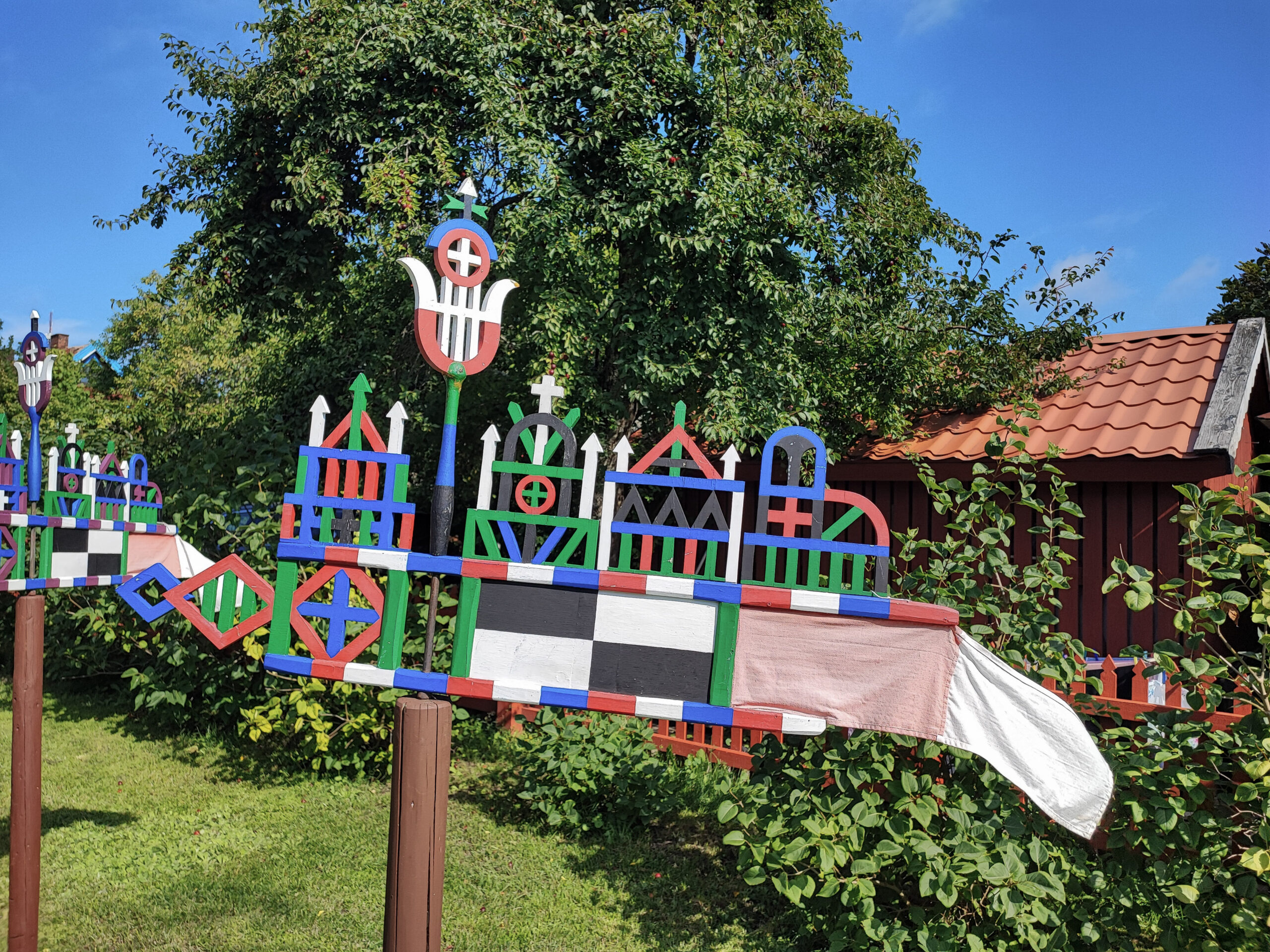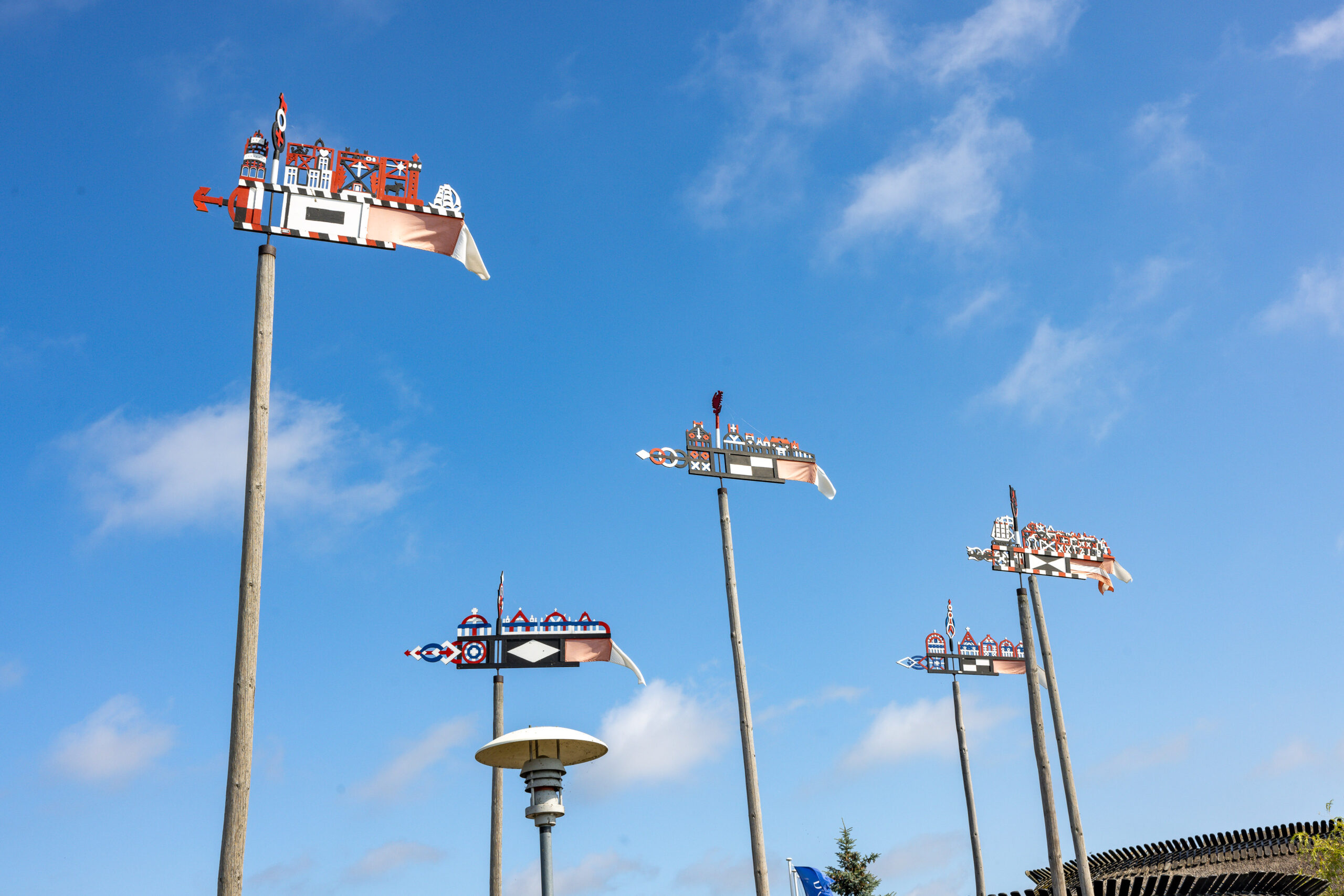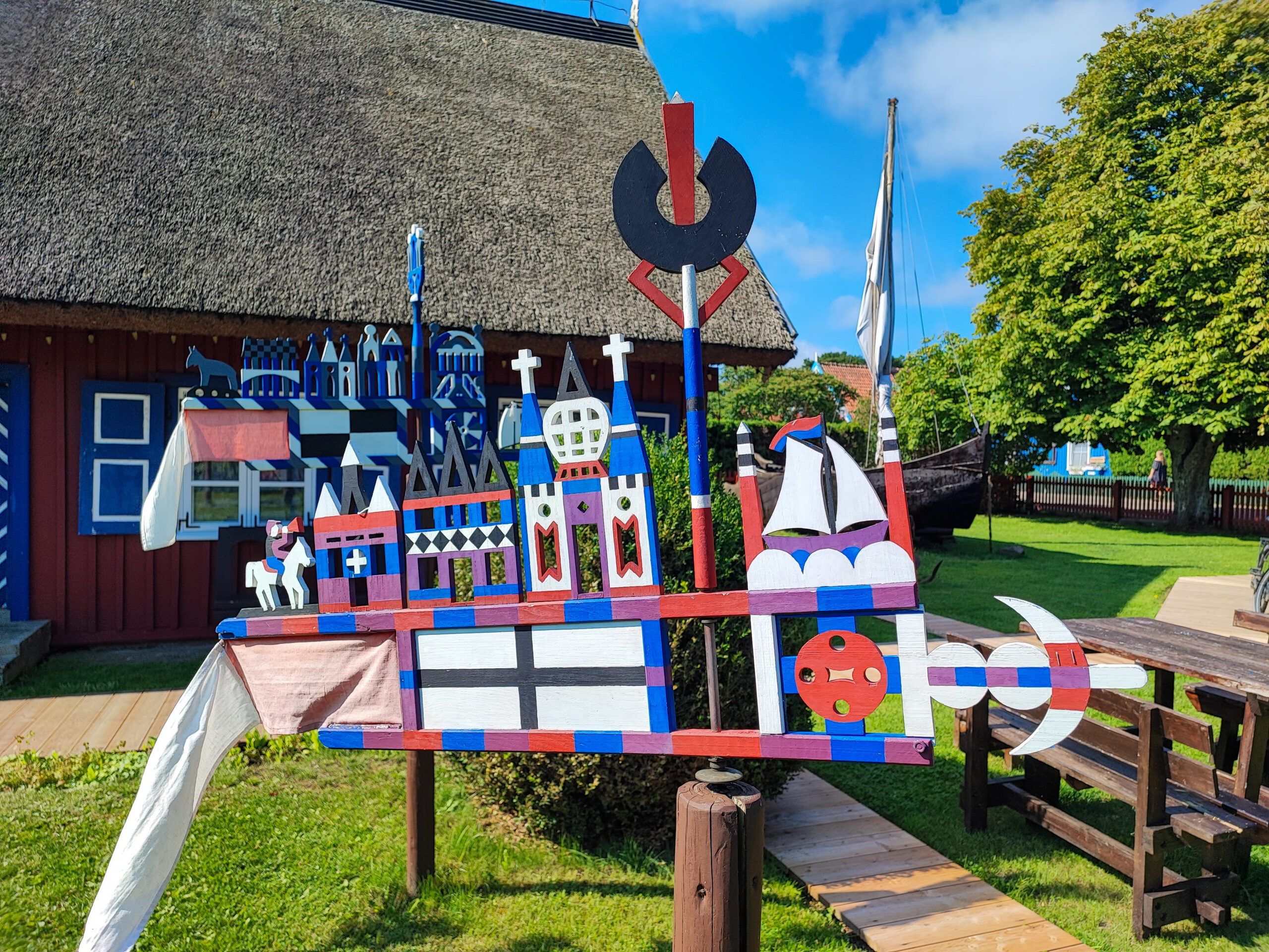 Wir nehmen die Räder und fahren durch Nida. Ein kleiner, gepflegter Ort direkt am Haff – mit einer langen Strandpromenade, alten Fischernetzen, die dekorativ aufgehängt sind, kleinen Cafés und Läden. Die Häuser sind rotbraun oder tiefblau gestrichen, die Dächer aus Schilf gedeckt, die Vorgärten voller Hortensien und Rosen. Vor vielen Häusern stehen hohe Holzmasten mit bunten, aufwändig geschnitzten Fahnen, die im Wind drehen und klappern.
