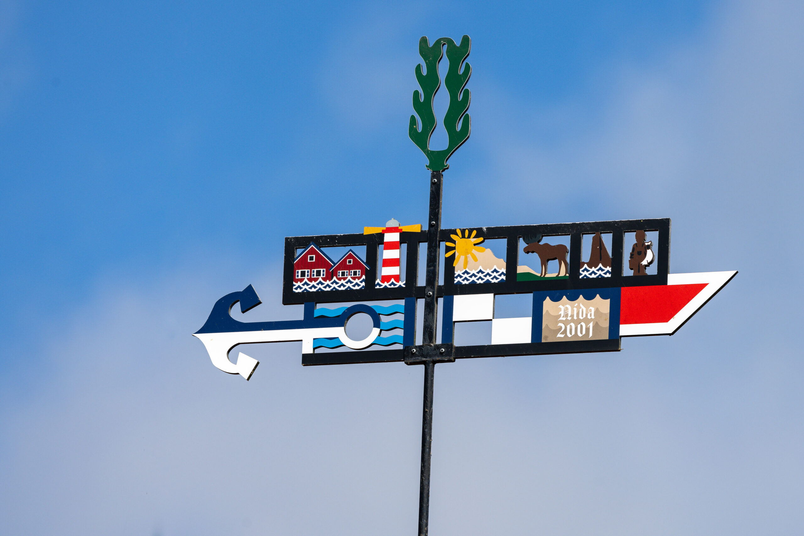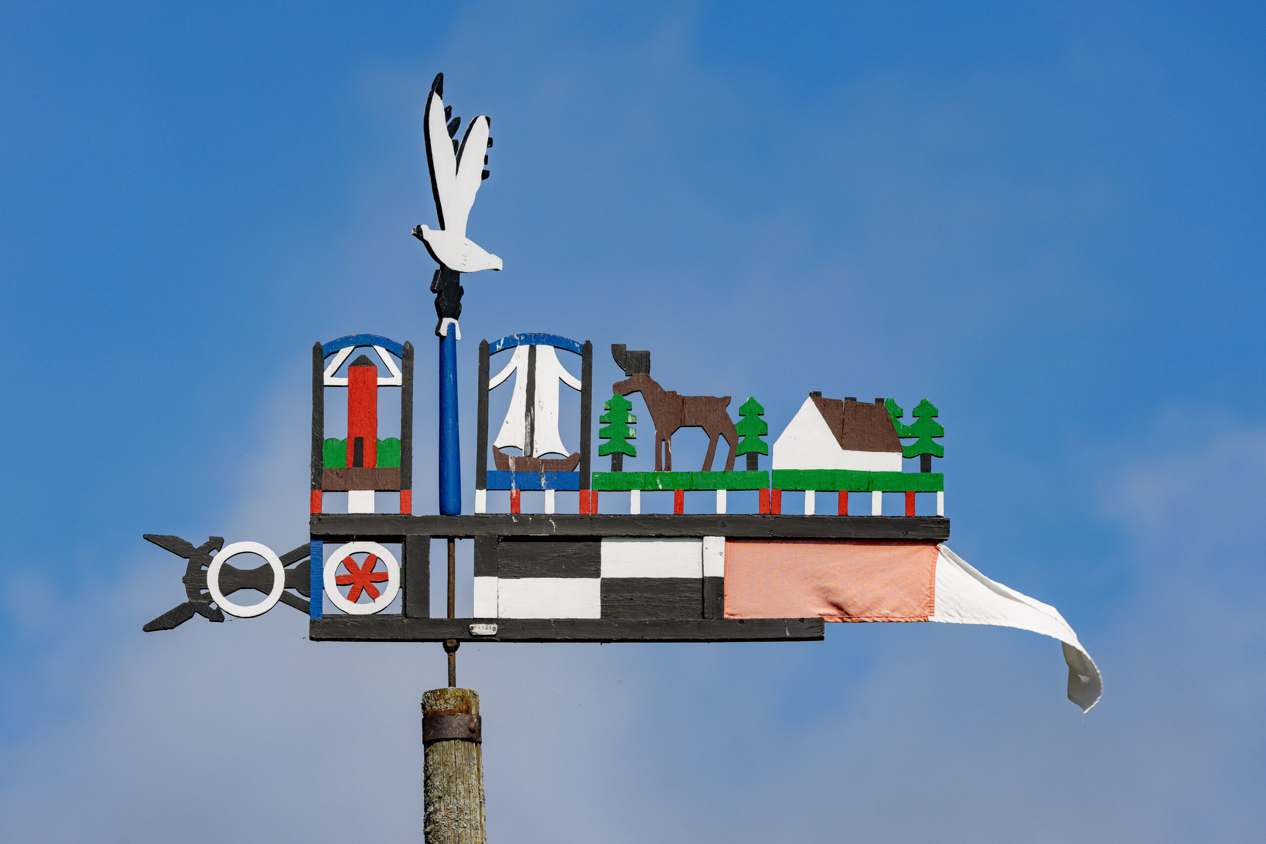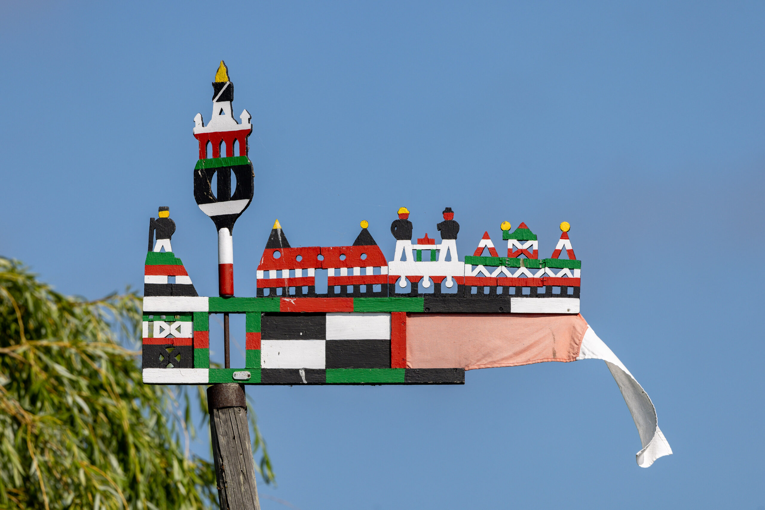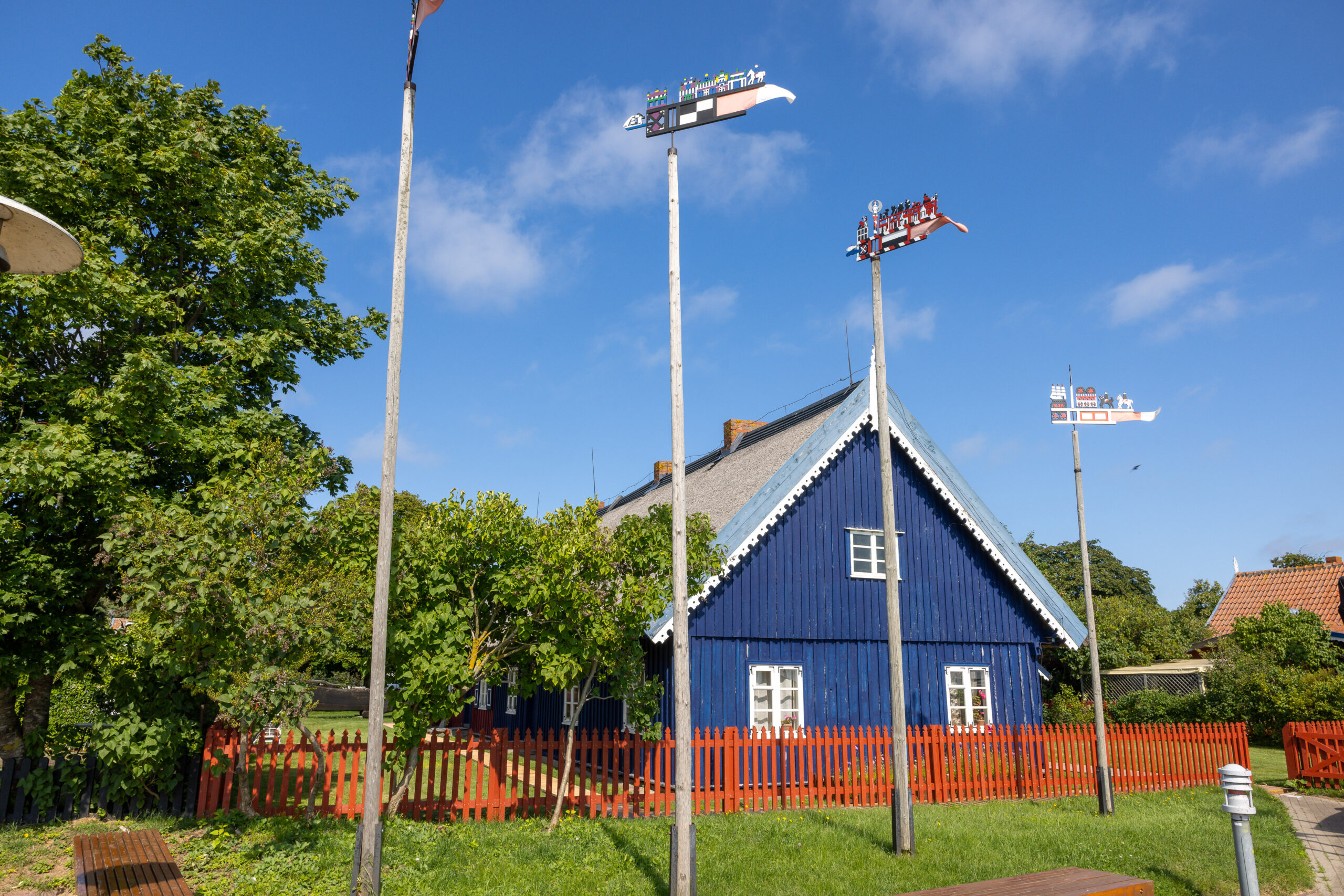 Die Kurenwimpel entstanden aus einer preußischen Fischereiverordnung von 1844: Alle Boote auf dem Kurischen Haff mussten einen Wimpel in den Farben ihres Heimathafens führen. Mit der Zeit wurden die Wimpel zu aufwändiger Volkskunst – handgeschnitzt, bemalt, mit Symbolen für Familie, Glaube und Herkunft. Die Nehrungsorte fuhren in Schwarz-Weiß. Die Farben der Häuser haben ebenfalls eine Bedeutung: Braun steht für die Erde, Blau für Himmel und Wasser, Weiß für Wolken und Schaumkronen. Heute sind die Kurenwimpel auf der Strandpromenade in Nida ausgestellt – ein Gang daran entlang ist wie eine Reise durch die Haffdörfer vergangener Jahrhunderte.