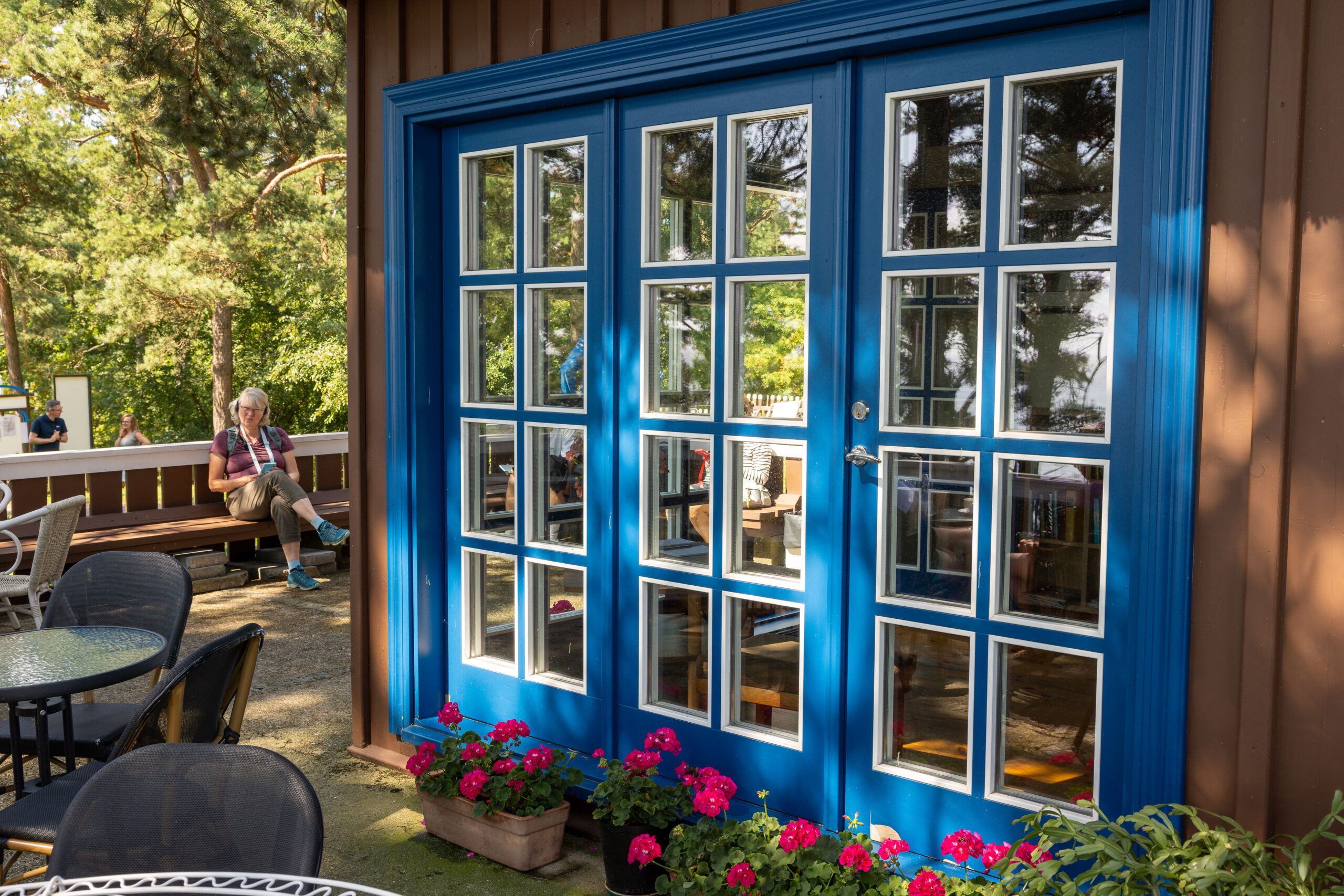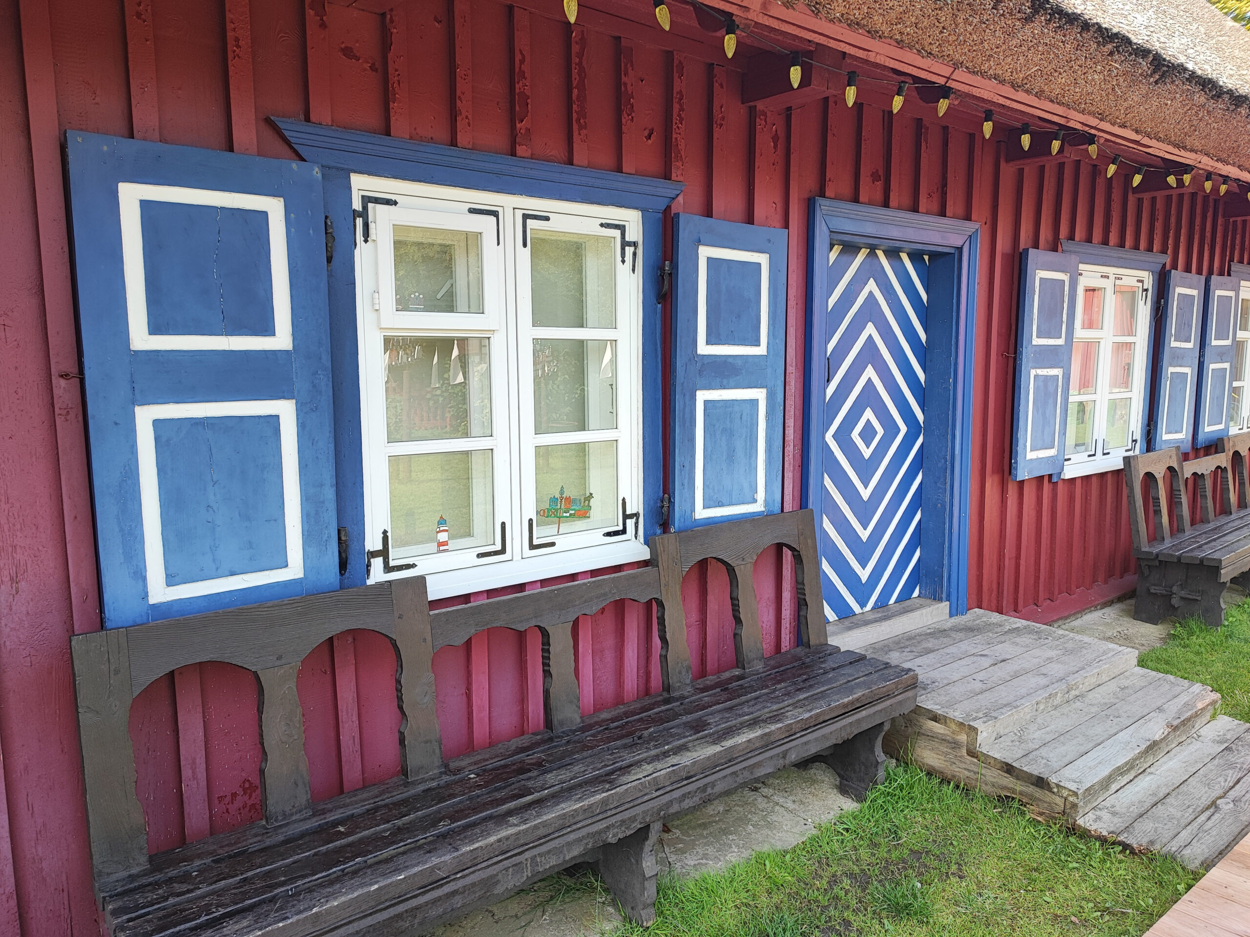 Von Nida aus fahren wir weiter nach Neringa – an wunderschönen Häusern vorbei, mal rotbraun, mal leuchtend blau, immer mit weißen Ornamenten, Gärten voller Farbe, Wimpel vor den Türen. Die Straße führt durch Kiefernwald, dann wieder an offene Stellen mit Blick auf das Haff. Es ist eine der schönsten Radtouren, die wir je gemacht haben.