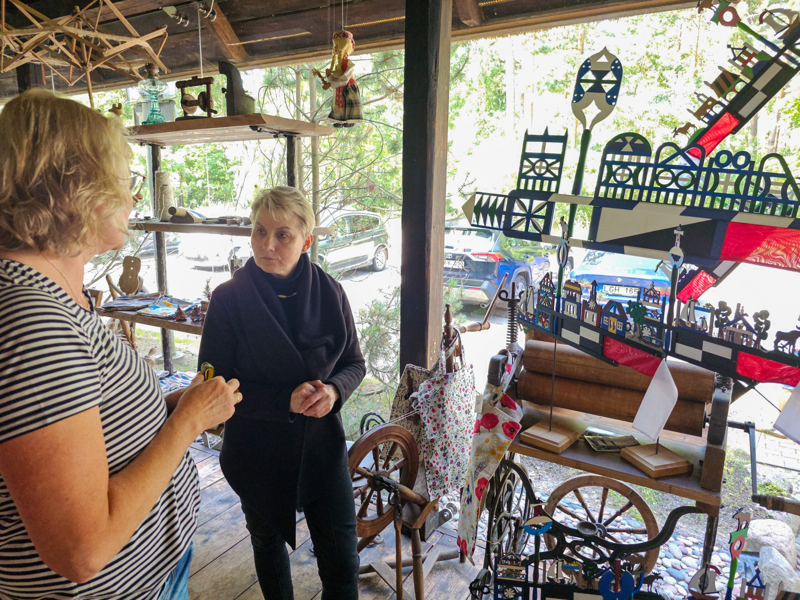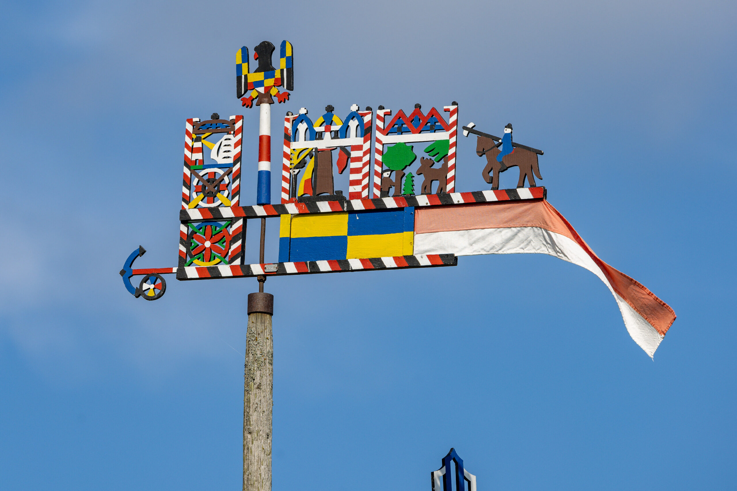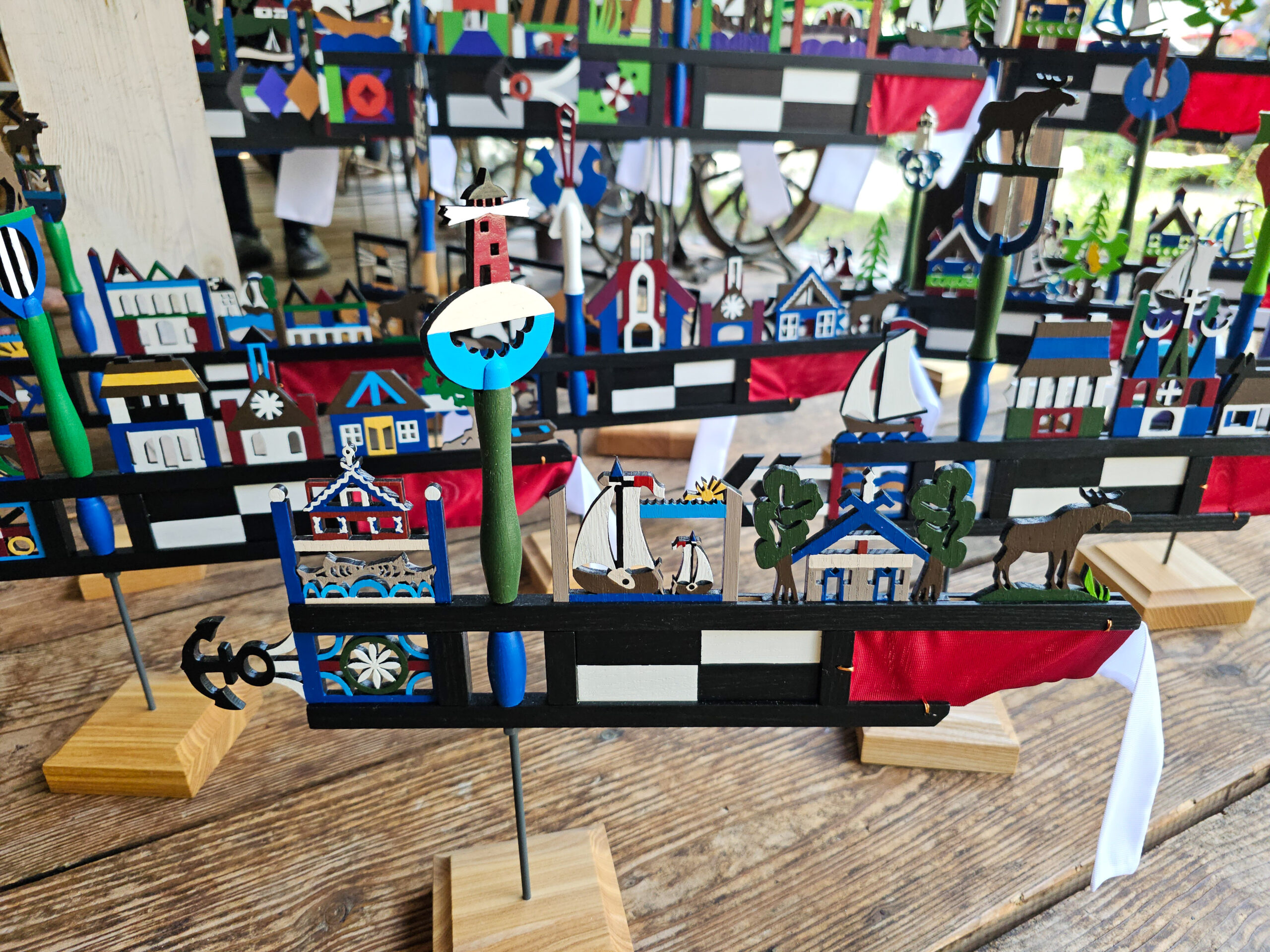 Die Fahnen heißen Kurenwimpel. Sie hingen früher an den Mastenspitzen der Fischerboote auf dem Haff. Jeder Wimpel war anders – nicht zur Dekoration, sondern als Kennzeichen. 1844 erließ die preußische Regierung in Königsberg eine Fischereiordnung: Jedes Boot musste seinen Heimathafen anzeigen. Jeder Ort bekam seine eigene Farb- und Zeichenkombination. Die Fischer der Kurischen Nehrung fuhren in Schwarz-Weiß. Auf dem östlichen Haffufer in Rot-Weiß. Im Süden in Blau-Gelb. Mit der Zeit begannen die Fischer, ihre Wimpel aufwändig zu schnitzen und zu bemalen – Boote, Häuser, Fische, Familienzeichen, Symbole für Kinder und Stand.