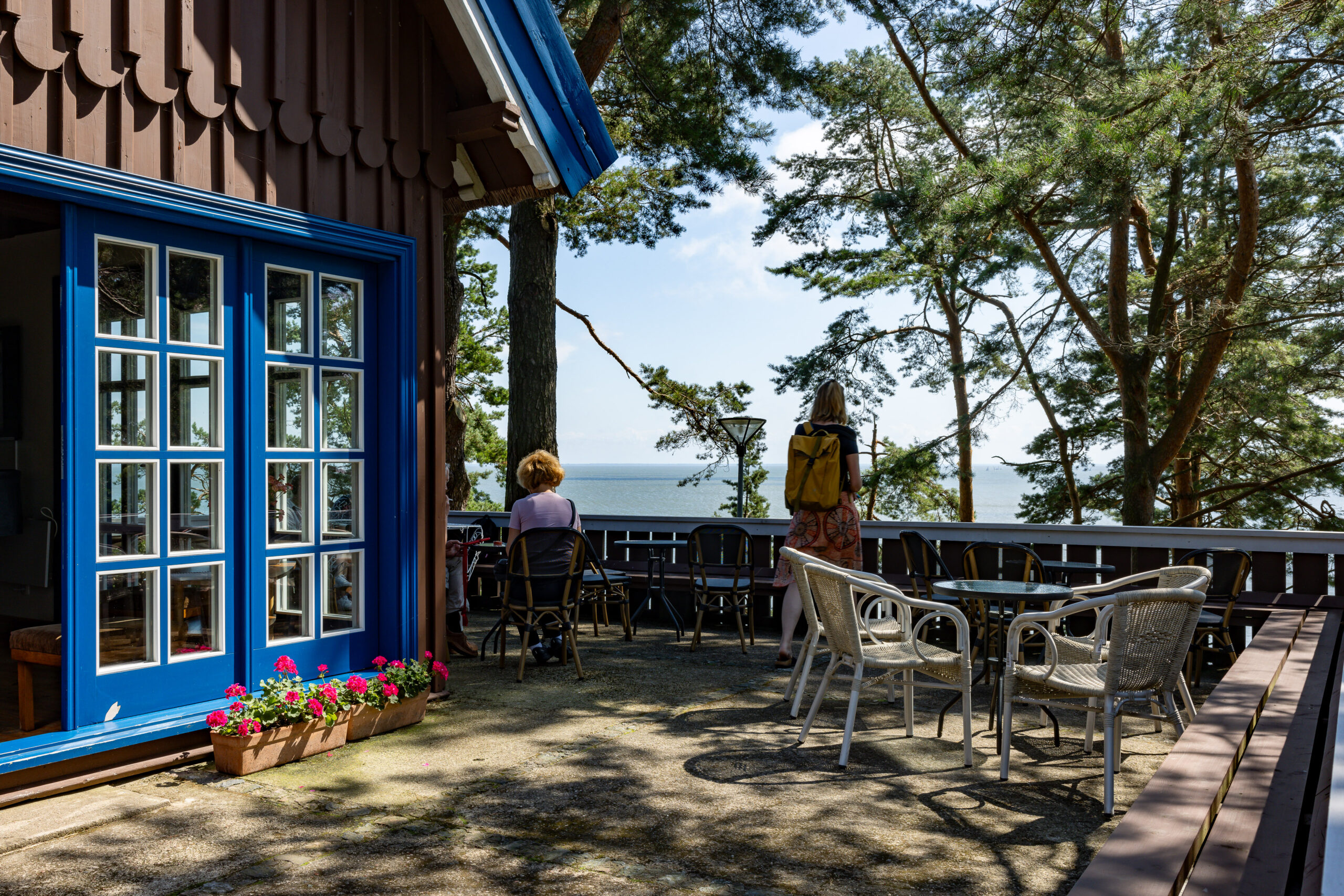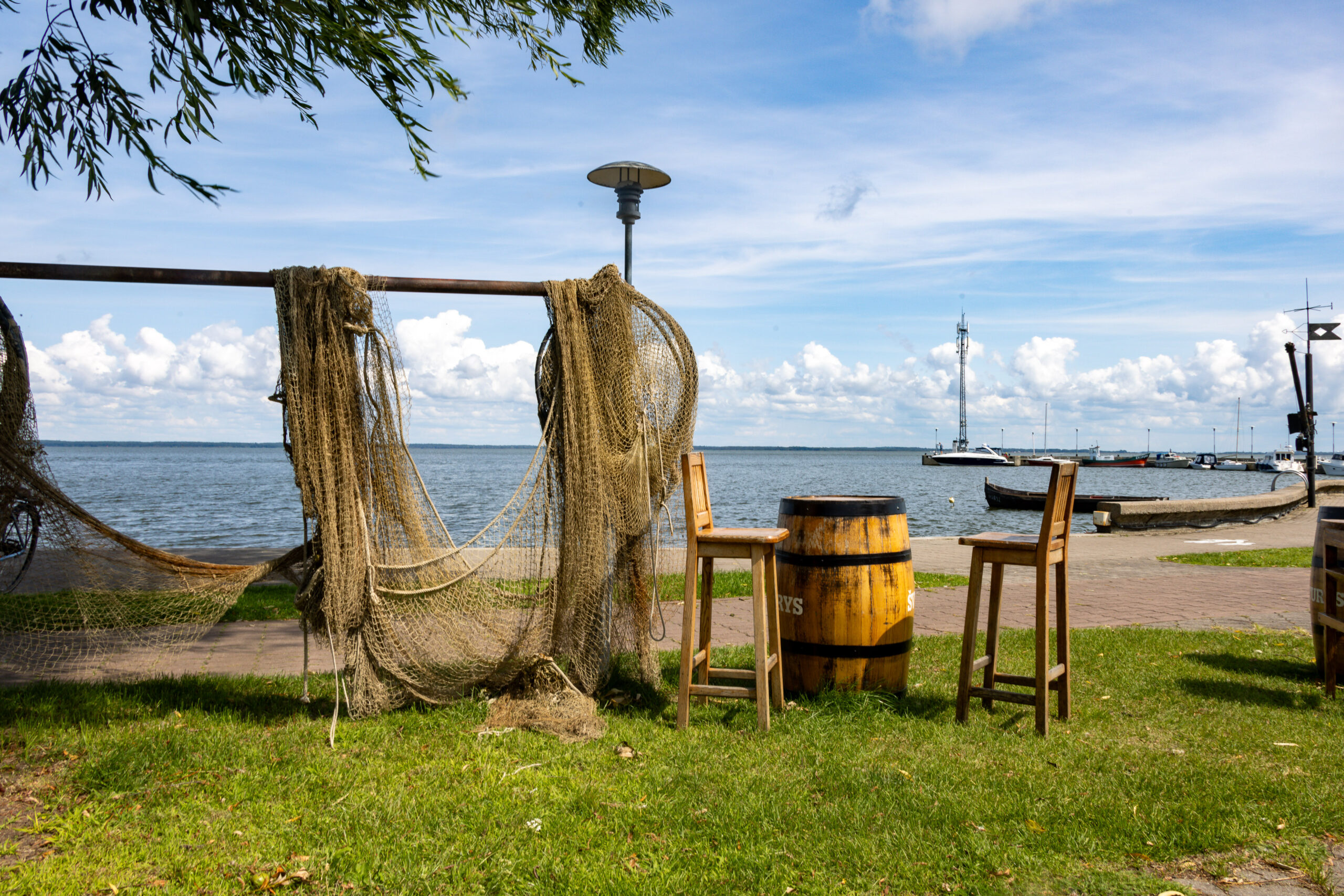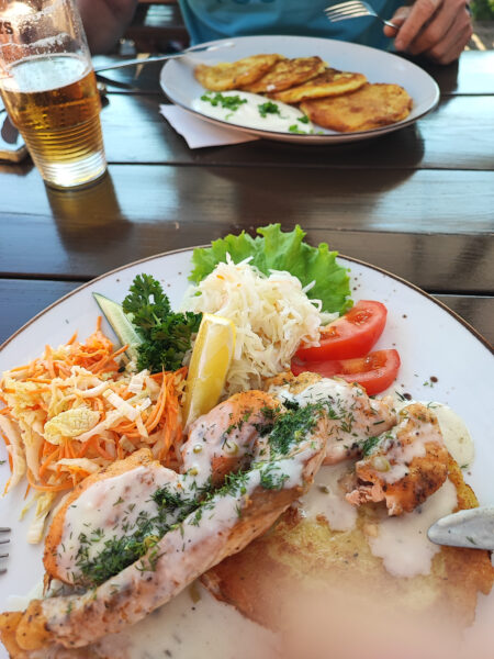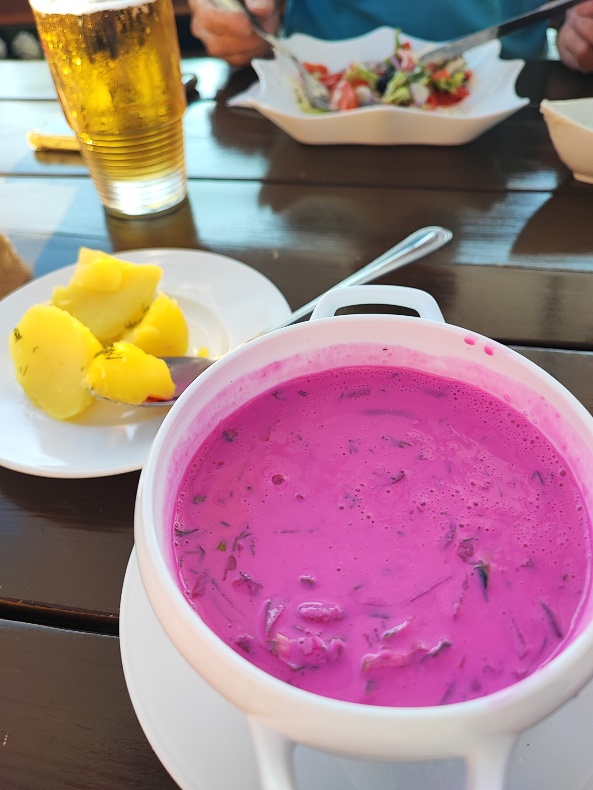 Wir sitzen draußen in der Sonne, vor einem der schönen alten Gasthäuser in Nida, direkt am Wasser. Die Küche ist deftig, ehrlich und gut – und überrascht uns immer wieder. Die Cepelinai, Litauens Nationalklöße, sind so groß wie ihre Namensgeber und kommen gefüllt mit Fleisch oder Quark, übergossen mit saurer Sahne und goldbraunen Speckwürfeln – eine Mahlzeit, nach der man nicht mehr viel braucht. Dazu geräucherter Fisch direkt vom Haff, frisches Schwarzbrot mit Kümmel, das man hier mit allem isst, und zum Abschluss eine kalte Rote-Bete-Suppe, die in der Hitze des Sommers genau das Richtige ist. Man isst hier, wie die Gegend ist: ursprünglich, ohne Schnörkel und mit echtem Charakter.