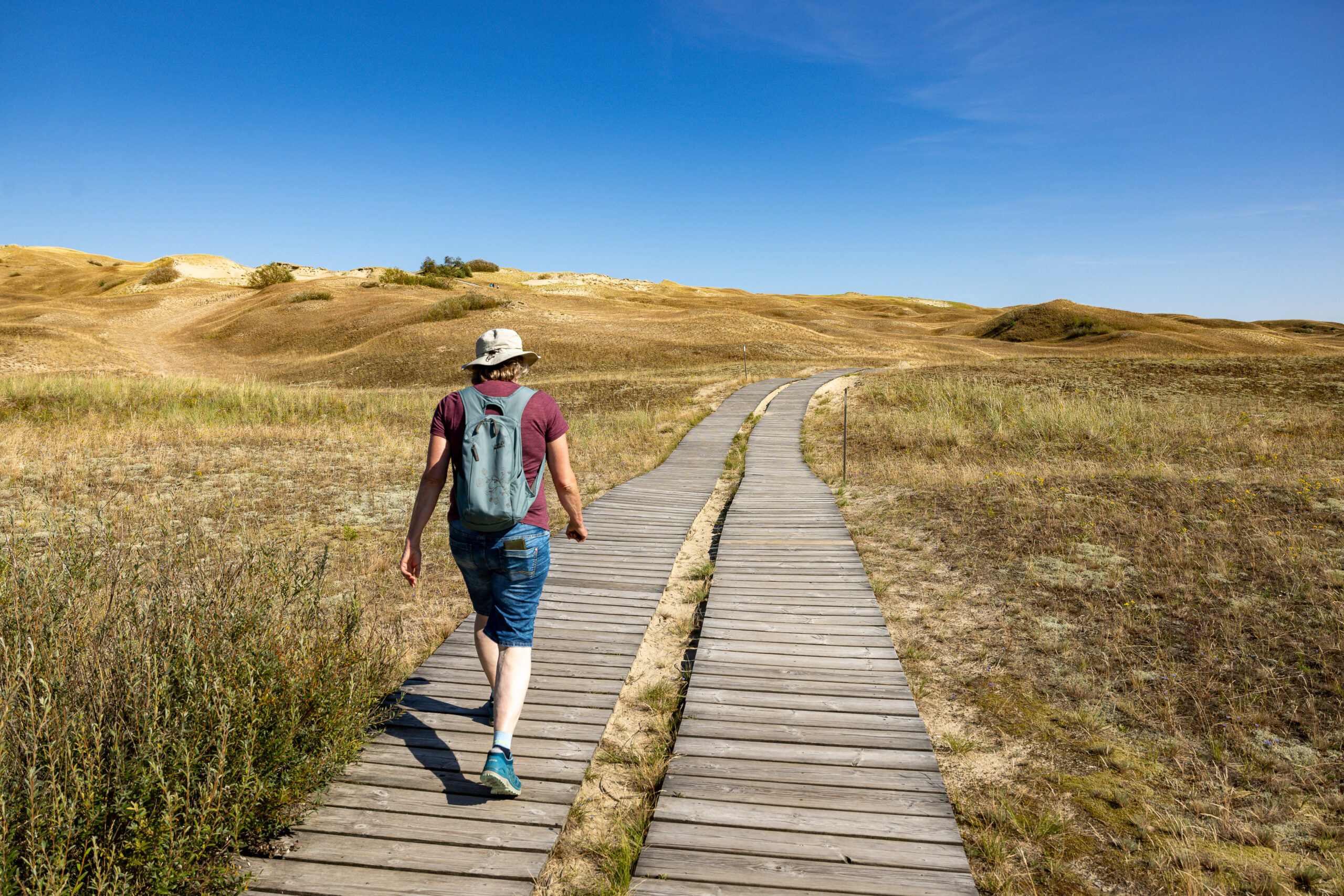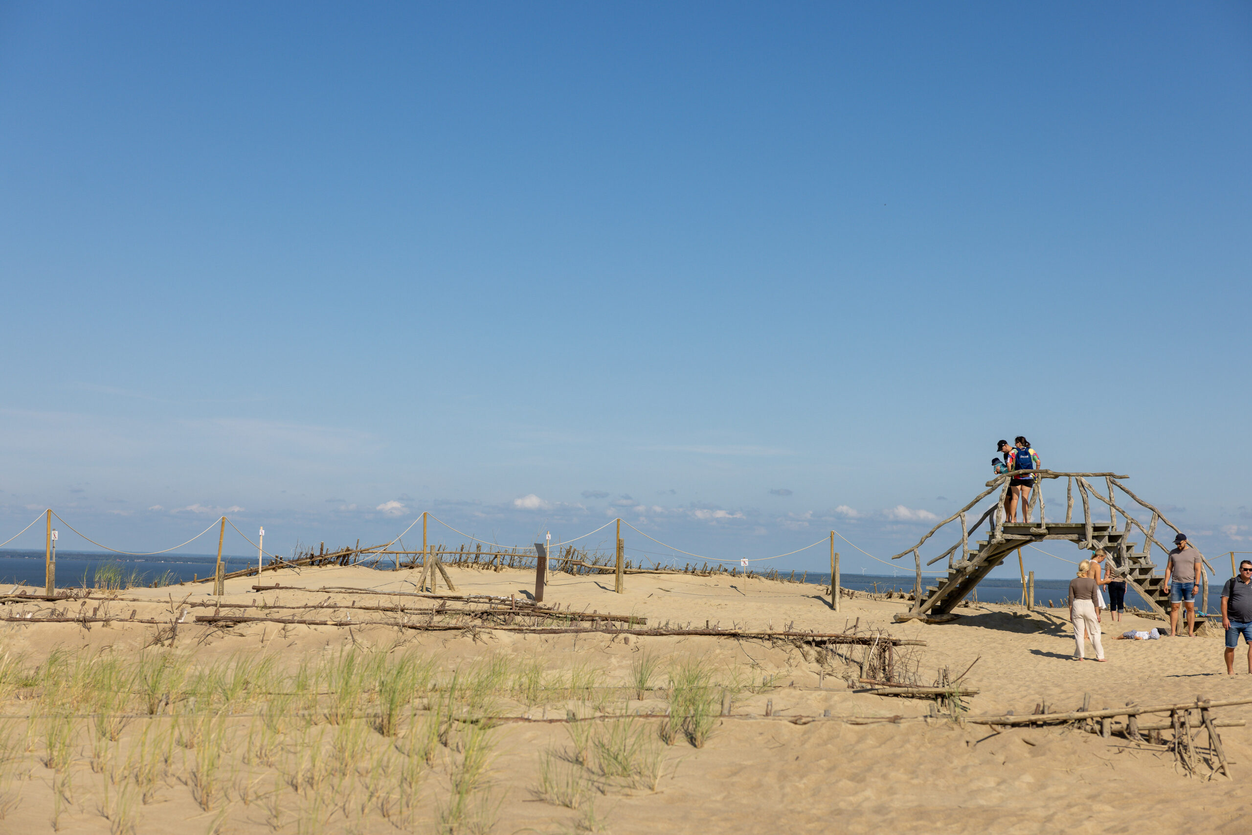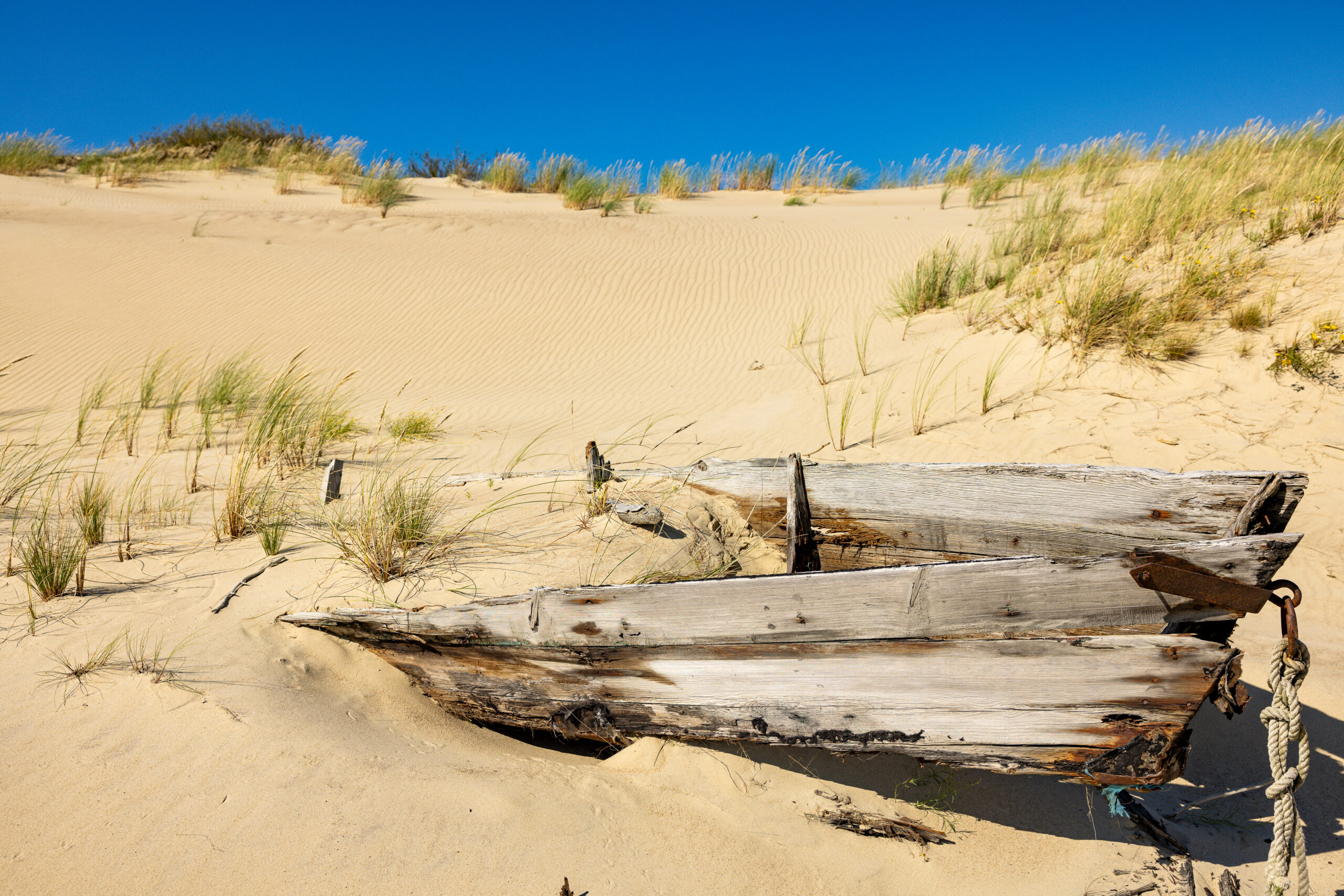 Und dann stehen wir dort. Es ist etwas anderes als die Parnidis-Düne. Hier ist alles weiter, stiller, wilder. Zwischen 1675 und dem frühen 20. Jahrhundert hat der Sand hier vier Dörfer vollständig begraben. Wer auf dem höchsten Punkt steht, steht buchstäblich über einer versunkenen Welt. Ein Bohlenweg führt durch das Dünengelände – dann hört er auf, und man läuft barfuß durch warmen, feinen Sand.