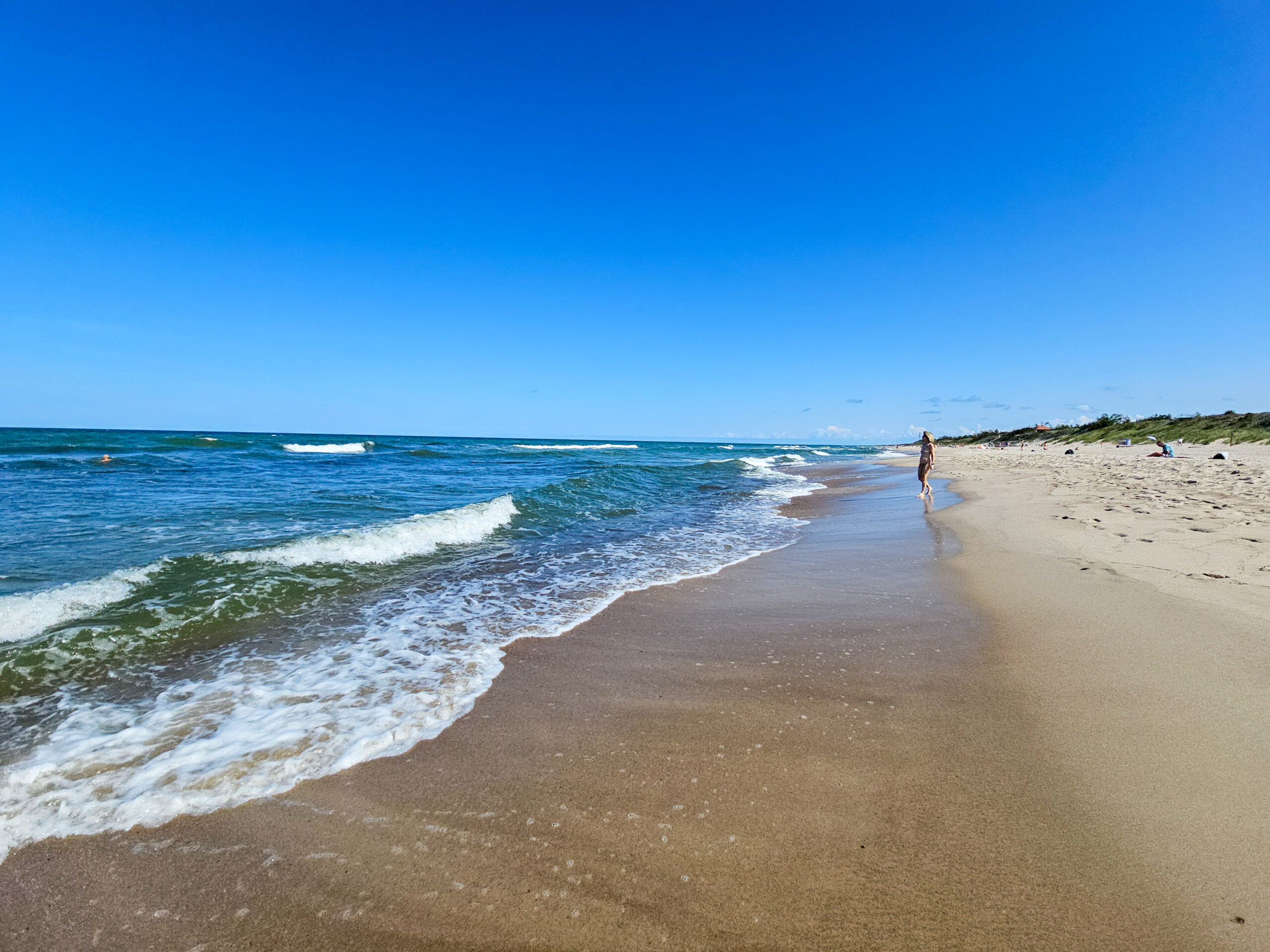 Unser Campingplatz liegt ideal: auf einer Seite der Kiefernwald, der uns vom Ort trennt, auf der anderen die Ostsee. Und direkt hinter dem Platz beginnt die Parnidis-Düne.